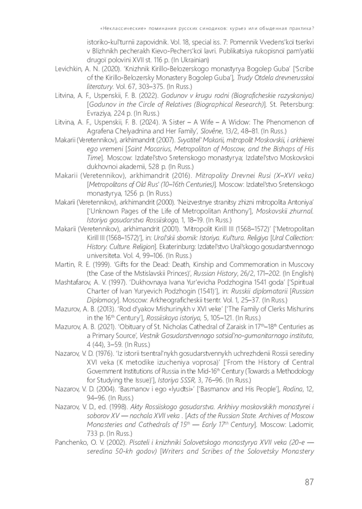 91. Martin R. E. Gifts for the Dead: Death, Kinship and Commemoration in Muscovy (the Case of the Mstislavskii Princes) // Russian History. 1999. Vol. 26, No 2. P. 171-202.