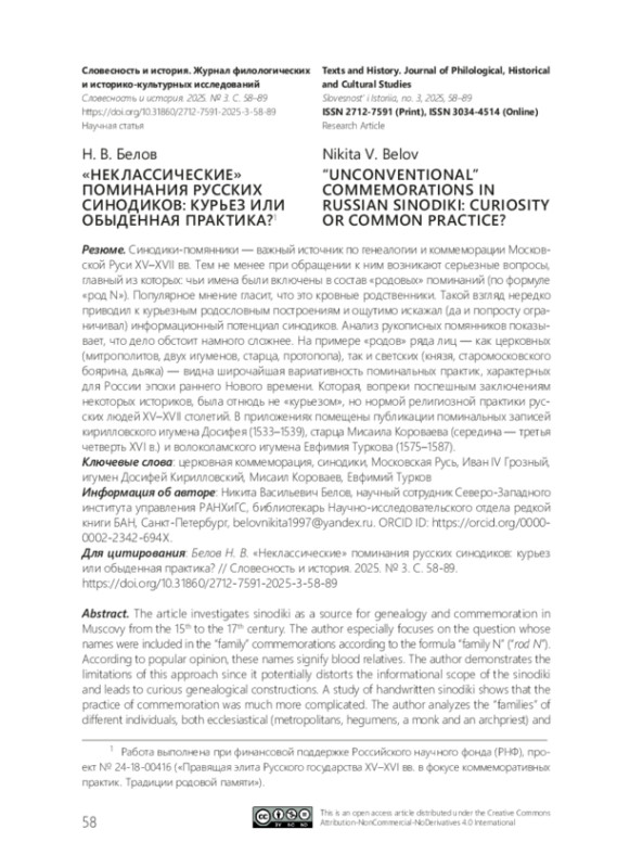 Синодики-помянники — важный источник по генеалогии и коммеморации Московской Руси XV–XVII вв. Тем не менее при обращении к ним возникают серьезные вопросы, главный из которых: чьи имена были включены в состав «родовых» поминаний (по формуле «род N»). Популярное мнение гласит, что это кровные родственники. Такой взгляд нередко приводил к курьезным родословным построениям и ощутимо искажал (да и попросту ограничивал) информационный потенциал синодиков. Анализ рукописных помянников показывает, что дело обстоит намного сложнее. На примере «родов» ряда лиц — как церковных (митрополитов, двух игуменов, старца, протопопа), так и светских (князя, старомосковского боярина, дьяка) — видна широчайшая вариативность поминальных практик, характерных для России эпохи раннего Нового времени. Которая, вопреки поспешным заключениям некоторых историков, была отнюдь не «курьезом», но нормой религиозной практики русских людей XV–XVII столетий. В приложениях помещены публикации поминальных записей кирилловского игумена Досифея (1533–1539), старца Мисаила Короваева (середина — третья четверть XVI в.) и волоколамского игумена Евфимия Туркова (1575–1587)