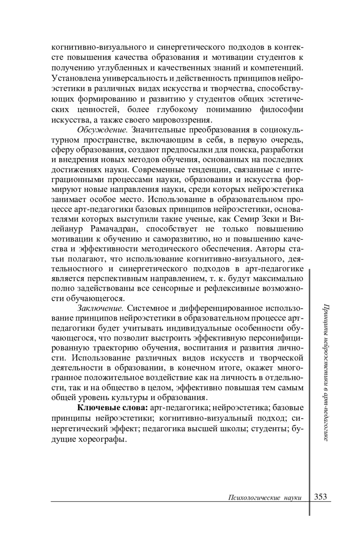 Обсуждение. Значительные преобразования в социокультурном пространстве, включающим в себя, в первую очередь, сферу образования, создают предпосылки для поиска, разработки и внедрения новых методов обучения, основанных на последних достижениях науки. Современные тенденции, связанные с интеграционными процессами науки, образования и искусства формируют новые направления науки, среди которых нейроэстетика занимает особое место. Использование в образовательном процессе арт-педагогики базовых принципов нейроэстетики, основателями которых выступили такие ученые, как Семир Зеки и Вилейанур Рамачадран, способствует не только повышению мотивации к обучению и саморазвитию, но и повышению качества и эффективности методического обеспечения. Авторы статьи полагают, что использование когнитивно-визуального, деятельностного и синергетического подходов в арт-педагогике является перспективным направлением, т. к. будут максимально полно задействованы все сенсорные и рефлексивные возможности обучающегося.