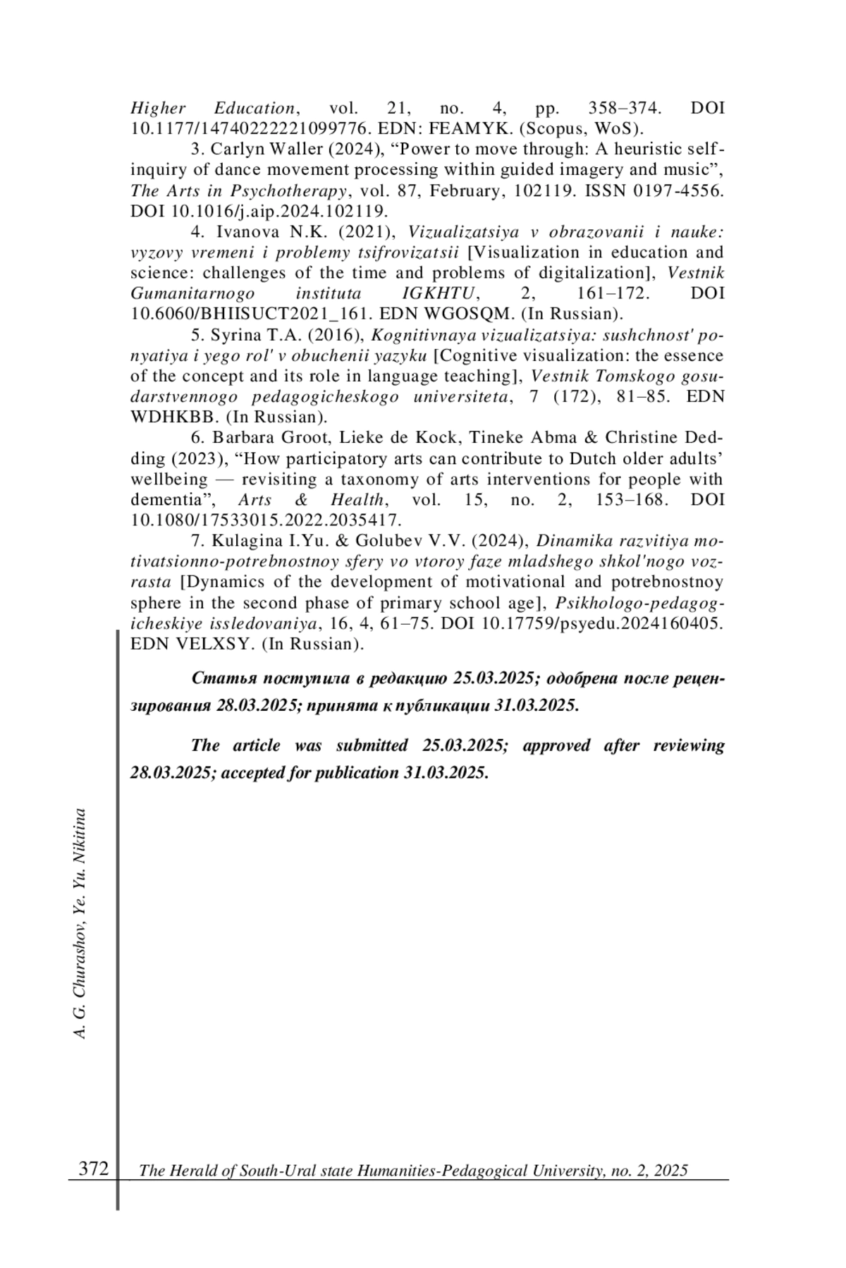 4. Иванова Н. К. Визуализация в образовании и науке: вызовы времени и проблемы цифровизации // Вестник Гуманитарного института ИГХТУ. 2021. № 2. С. 161-172. DOI: 10.6060/BHIISUCT2021_161 EDN: WGOSQM