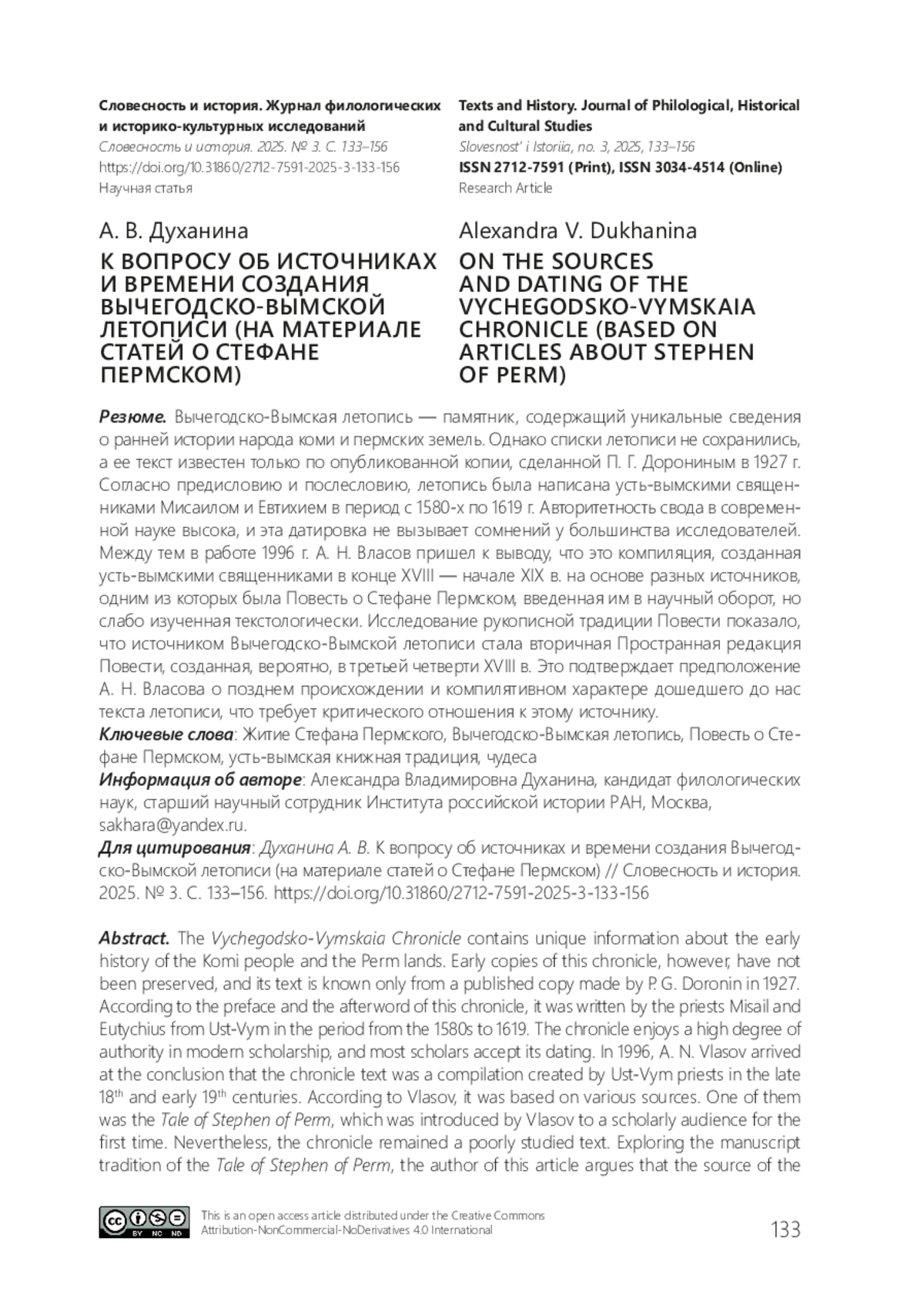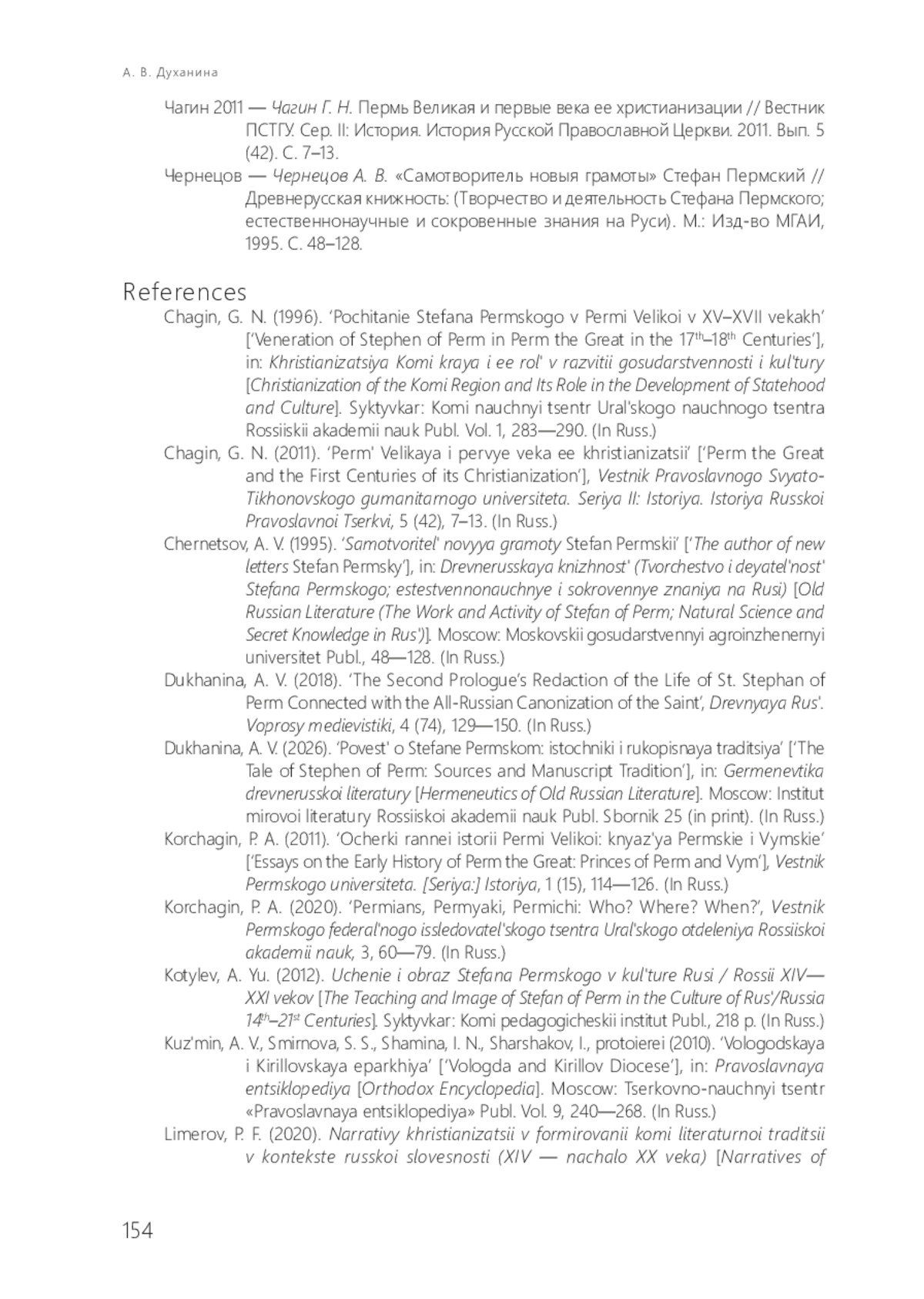 7. Духанина А. В. Повесть о Стефане Пермском: источники и рукописная традиция // Герменевтика древнерусской литературы. М.: ИМЛИ РАН, 2026. Сб. 25 (в печати).