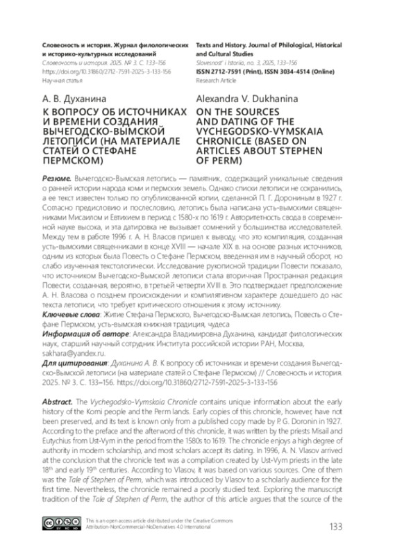 Вычегодско-Вымская летопись — памятник, содержащий уникальные сведения о ранней истории народа коми и пермских земель. Однако списки летописи не сохранились, а ее текст известен только по опубликованной копии, сделанной П. Г. Дорониным в 1927 г. Согласно предисловию и послесловию, летопись была написана усть-вымскими священниками Мисаилом и Евтихием в период с 1580-х по 1619 г. Авторитетность свода в современной науке высока, и эта датировка не вызывает сомнений у большинства исследователей. Между тем в работе 1996 г. А. Н. Власов пришел к выводу, что это компиляция, созданная усть-вымскими священниками в конце XVIII — начале XIX в. на основе разных источников, одним из которых была Повесть о Стефане Пермском, введенная им в научный оборот, но слабо изученная текстологически. Исследование рукописной традиции Повести показало, что источником Вычегодско-Вымской летописи стала вторичная Пространная редакция Повести, созданная, вероятно, в третьей четверти XVIII в. Это подтверждает предположение А. Н. Власова о позднем происхождении и компилятивном характере дошедшего до нас текста летописи, что требует критического отношения к этому источнику.