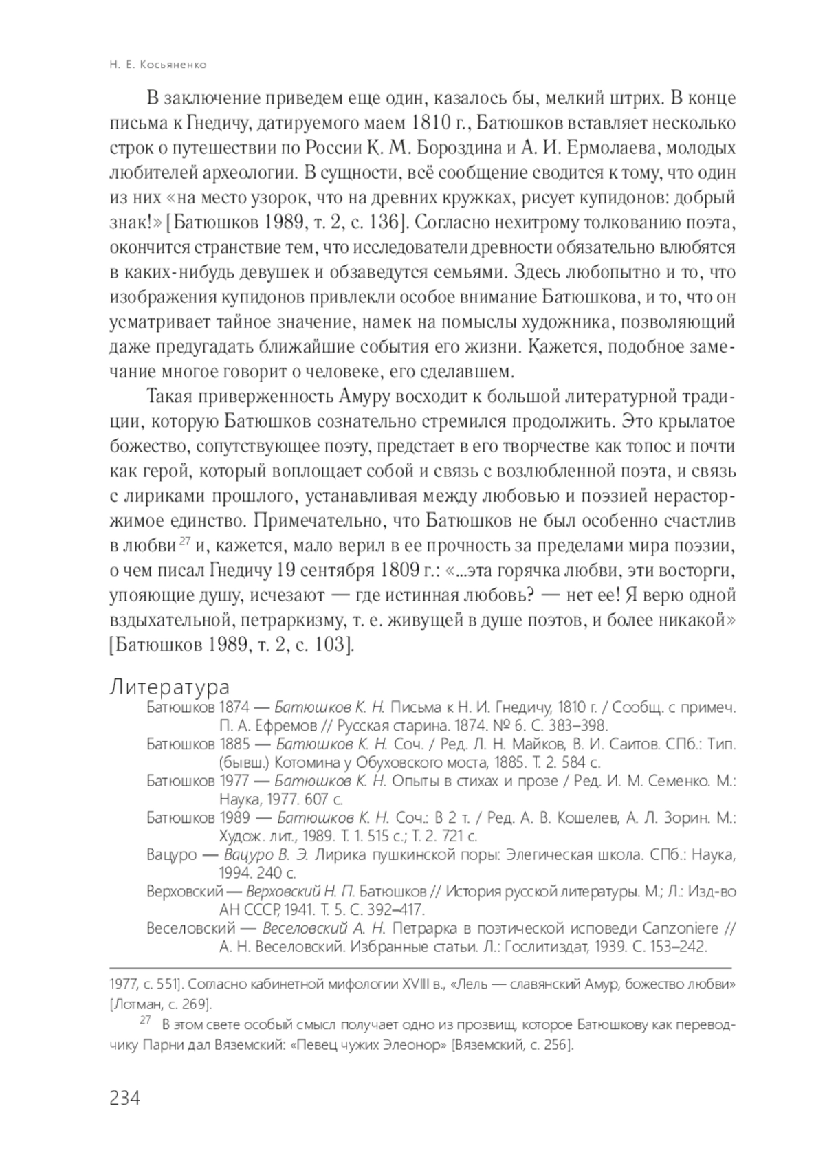 Статья посвящена одному из частотных в поэзии К. Н. Батюшкова топосов европейской литературы — образу Амура, античного бога любви. Внимательное прочтение и сопоставление текстов русского поэта с элегиями Тибулла, Проперция и Парни, лирикой Петрарки, произведениями Вольтера и русских поэтов XVIII века, а также с «Опытами» Монтеня демонстрирует преемственность между большой литературной традицией Запада и стихами Батюшкова. В то же время поэт существенно переосмысляет мотивы, унаследованные им от предшественников: лирика Батюшкова устанавливает нерасторжимую связь между любовью и поэзией, так что Купидон оказывается неизменным спутником поэта и связывает его не только с возлюбленной, но и с тенями стихотворцев, которые воспевали радости любви