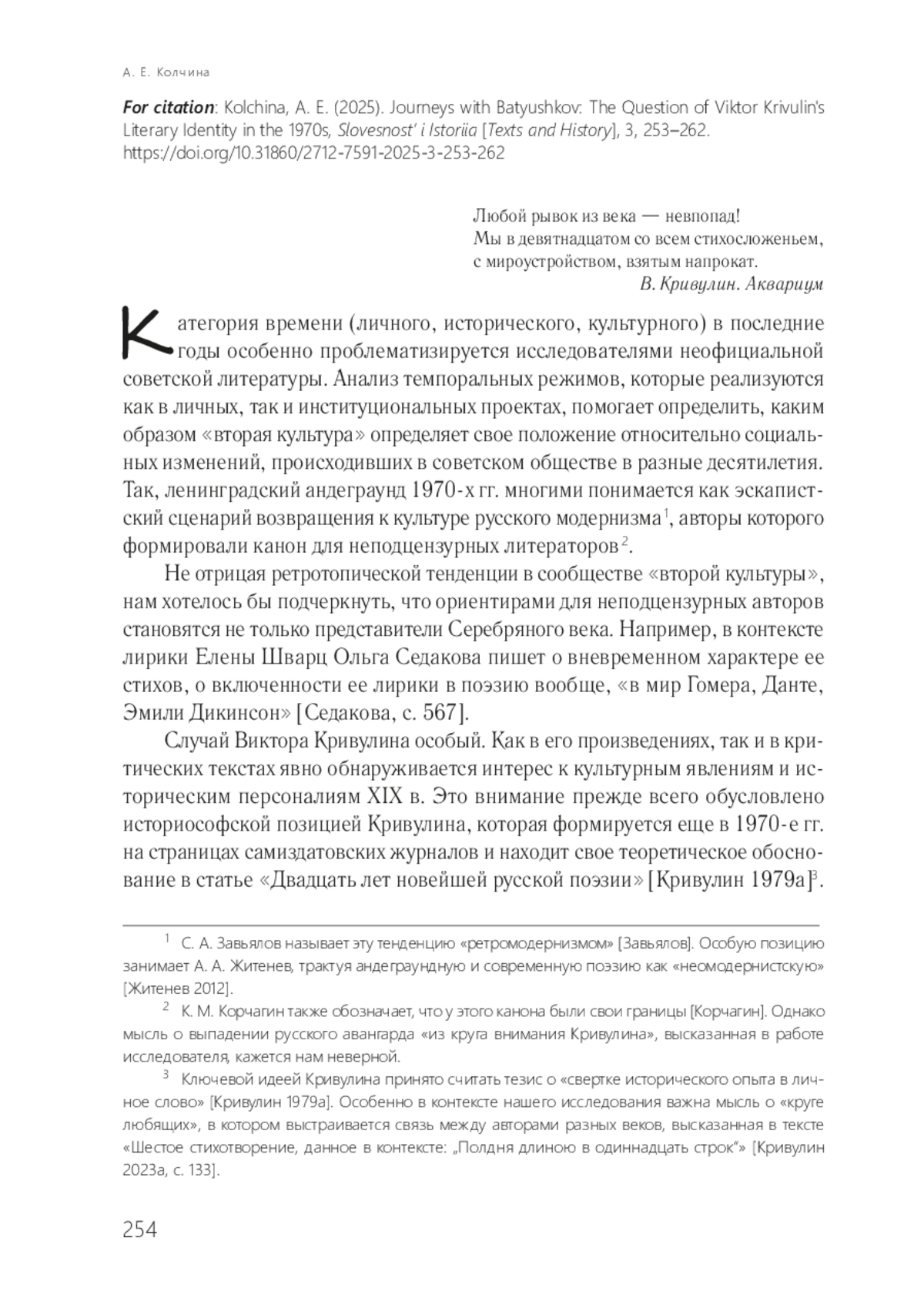 Категория времени (личного, исторического, культурного) в последние годы особенно проблематизируется исследователями неофициальной советской литературы. Анализ темпоральных режимов, которые реализуются как в личных, так и институциональных проектах, помогает определить, каким образом «вторая культура» определяет свое положение относительно социальных изменений, происходивших в советском обществе в разные десятилетия. Так, ленинградский андеграунд 1970-х гг. многими понимается как эскапистский сценарий возвращения к культуре русского модернизма 1, авторы которого формировали канон для неподцензурных литераторов