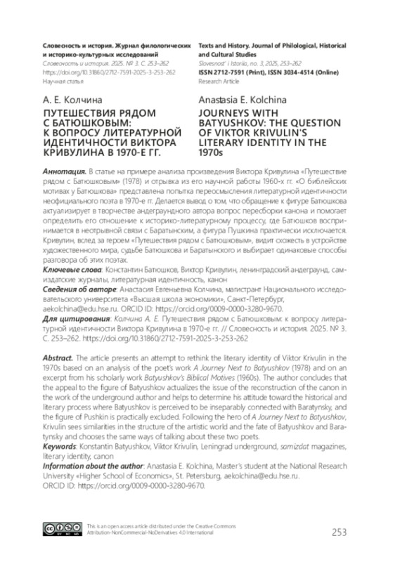 В статье на примере анализа произведения Виктора Кривулина «Путешествие рядом с Батюшковым» (1978) и отрывка из его научной работы 1960-х гг. «О библейских мотивах у Батюшкова» представлена попытка переосмысления литературной идентичности неофициального поэта в 1970-е гг. Делается вывод о том, что обращение к фигуре Батюшкова актуализирует в творчестве андеграундного автора вопрос пересборки канона и помогает определить его отношение к историко-литературному процессу, где Батюшков воспринимается в неотрывной связи с Баратынским, а фигура Пушкина практически исключается. Кривулин, вслед за героем «Путешествия рядом с Батюшковым», видит схожесть в устройстве художественного мира, судьбе Батюшкова и Баратынского и выбирает одинаковые способы разговора об этих поэтах