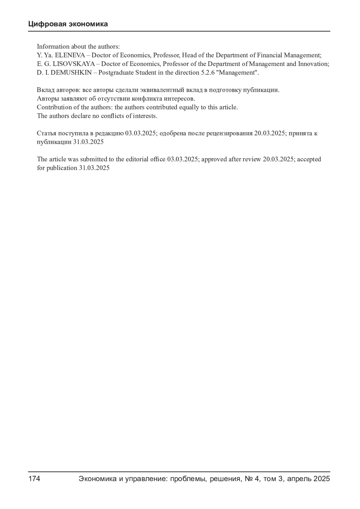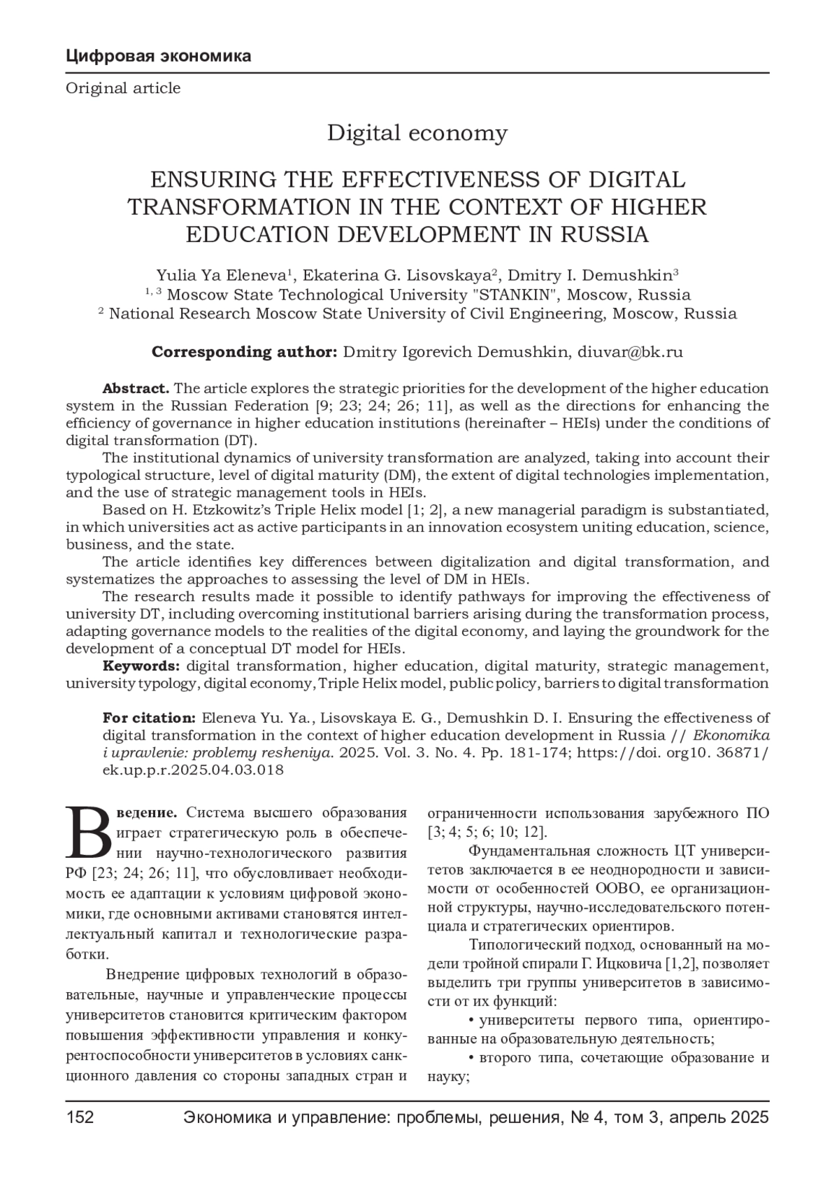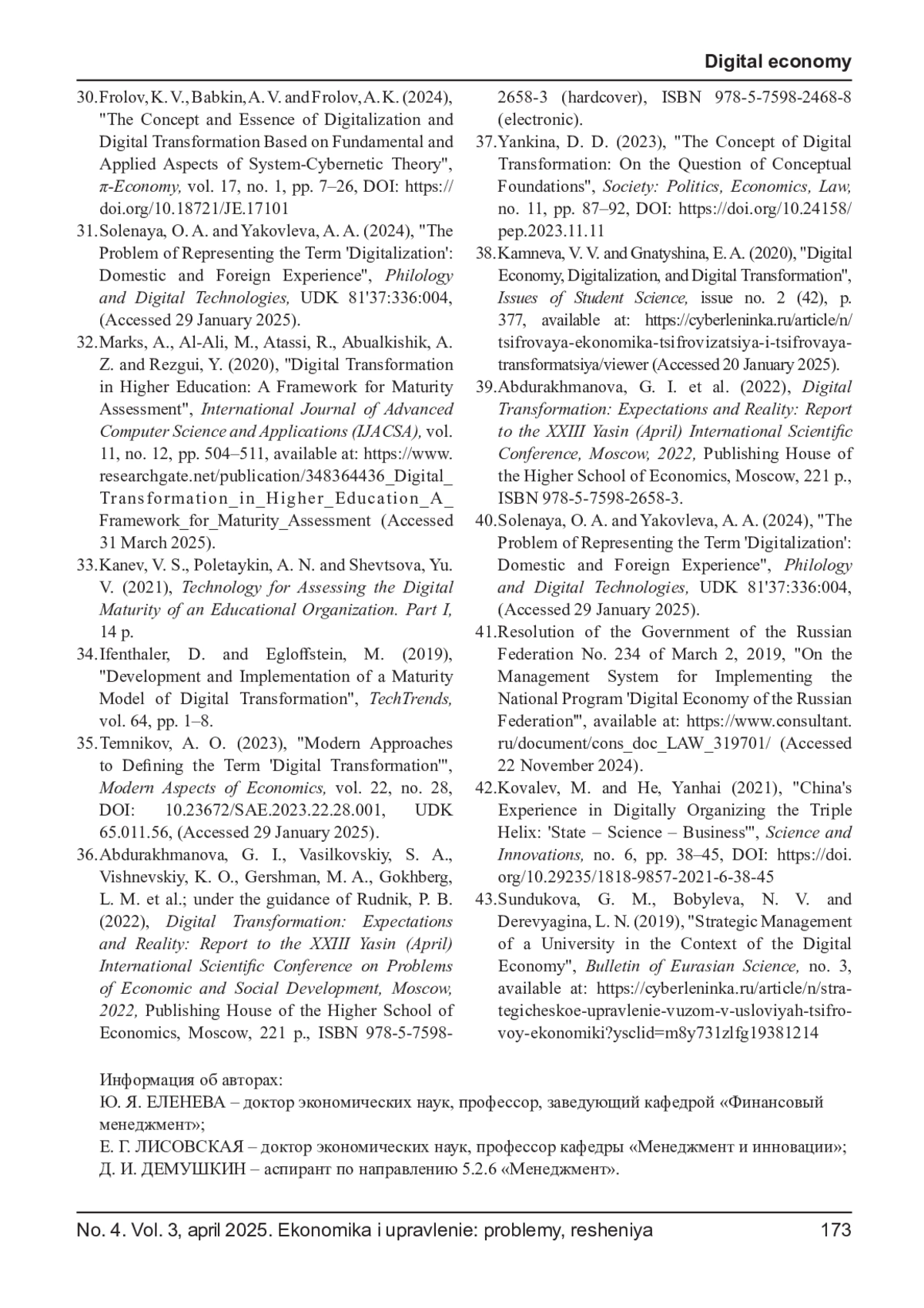 4. Еленева Ю. Я., Можаровская А. А., Демушкин Д. И. Методические подходы к проведению цифровой трансформации и оценке её эффективности в образовательных организациях высшего образования // Экономика, предпринимательство и право. - 2024. - Т. 14, № 6. - С. 2831-2854. -. DOI: 10.18334/epp.14.6.121236 EDN: IWVAVZ