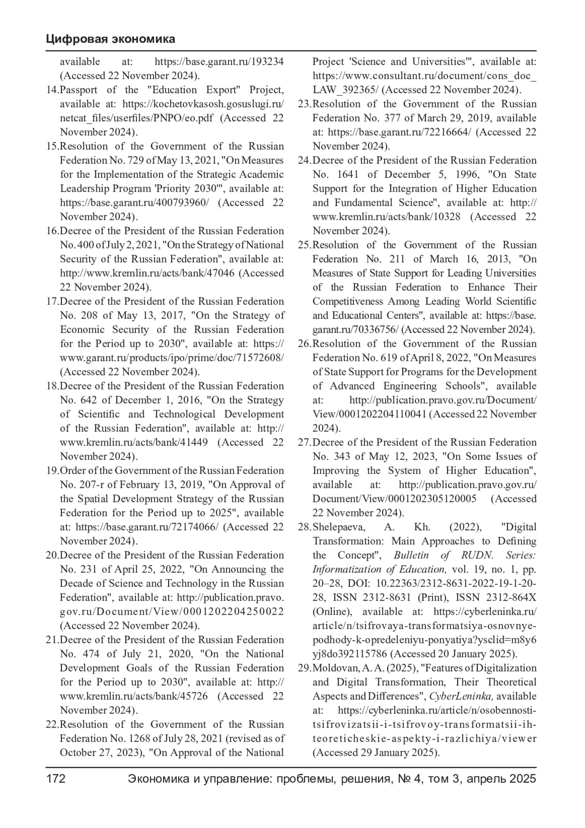 31. Соленая О. А., Яковлева А. А. Проблема представления термина “Цифровизация”: отечественный и зарубежный опыт // Филология и цифровые технологии. - 2024. - УДК 81’37:336:004. (дата обращения: 29.01.2025).