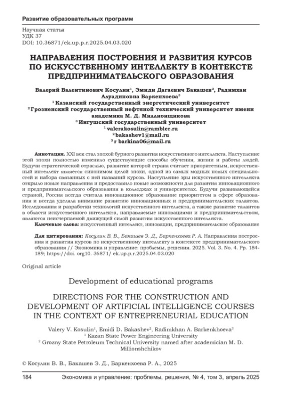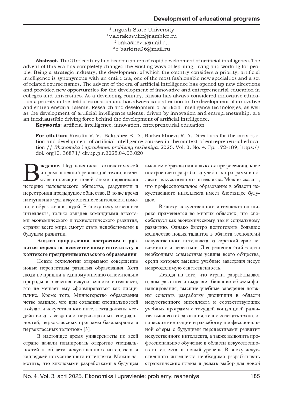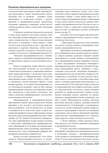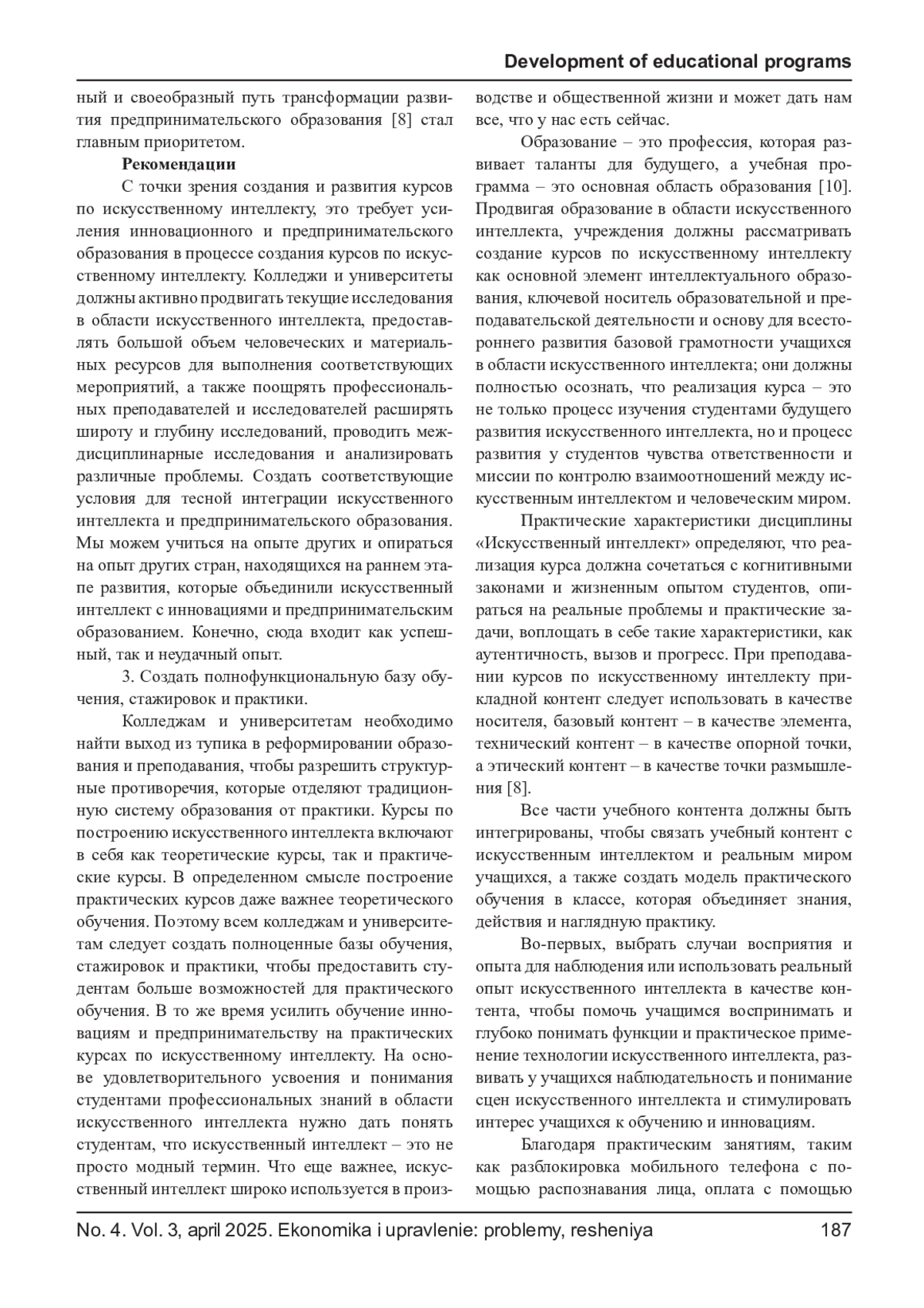 XXI век стал эпохой бурного развития искусственного интеллекта. Наступление этой эпохи полностью изменило существующие способы обучения, жизни и работы людей. Будучи стратегической отраслью, развитие которой страна считает приоритетным, искусственный интеллект является синонимом целой эпохи, одной из самых модных новых специальностей и набора связанных с ней названий курсов. Наступление эры искусственного интеллекта открыло новые направления и предоставило новые возможности для развития инновационного и предпринимательского образования в колледжах и университетах. Будучи развивающейся страной, Россия всегда считала инновационное образование приоритетом в сфере образования и всегда уделяла внимание развитию инновационных и предпринимательских талантов. Исследования и разработки технологий искусственного интеллекта, а также развитие талантов в области искусственного интеллекта, направляемые инновациями и предпринимательством, являются неисчерпаемой движущей силой развития искусственного интеллекта.
