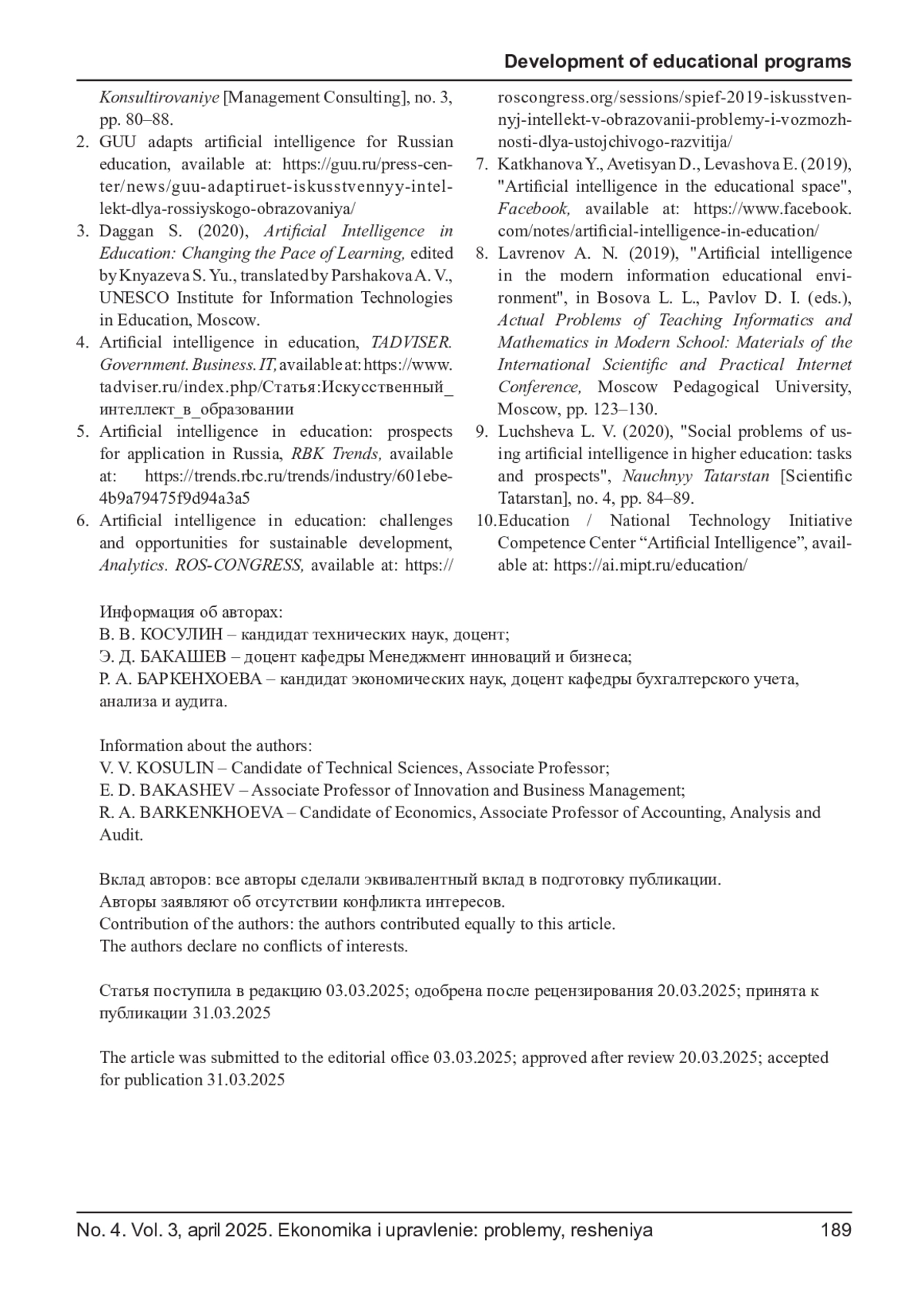 1. Амиров Р. А., Билалова У. М. Перспективы внедрения технологий искусственного интеллекта в сфере высшего образования // Управленческое консультирование. - 2020. - № 3. - С. 80-88. EDN: XKTQTC