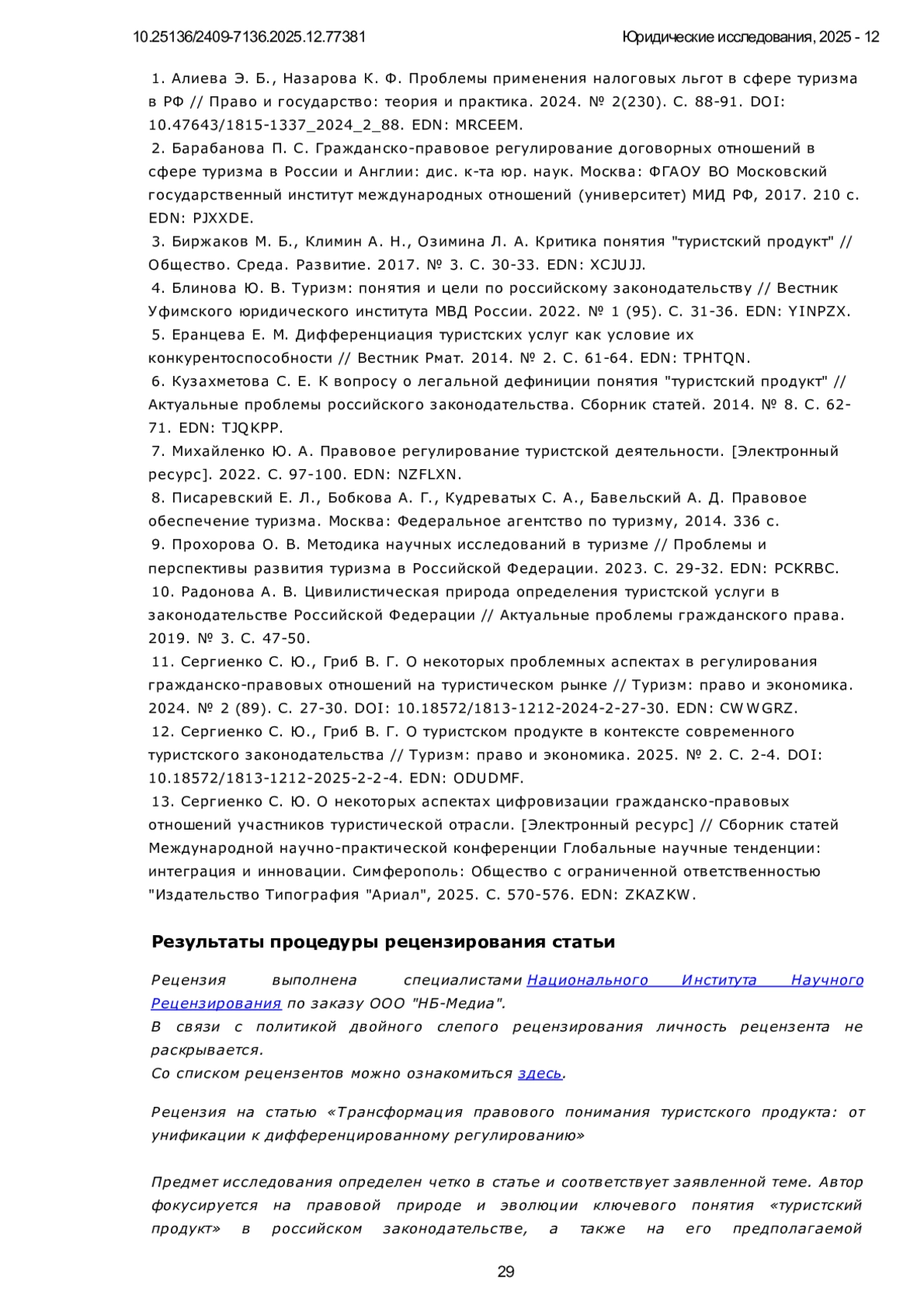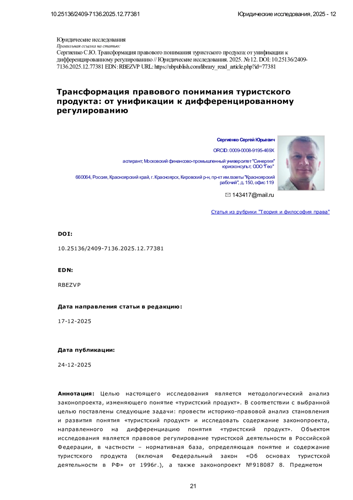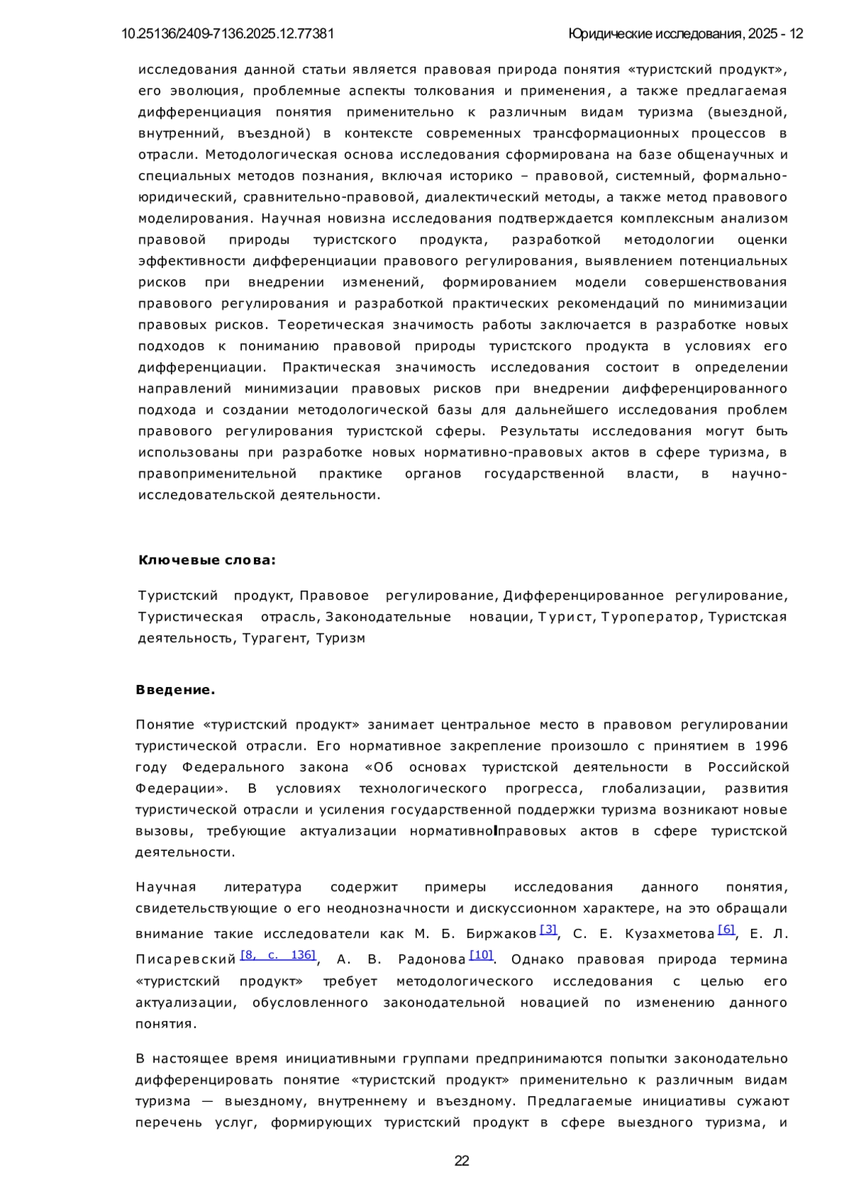Целью настоящего исследования является методологический анализ законопроекта, изменяющего понятие «туристский продукт». В соответствии с выбранной целью поставлены следующие задачи: провести историко-правовой анализ становления и развития понятия «туристский продукт» и исследовать содержание законопроекта, направленного на дифференциацию понятия «туристский продукт». Объектом исследования является правовое регулирование туристской деятельности в Российской Федерации, в частности – нормативная база, определяющая понятие и содержание туристского продукта (включая Федеральный закон «Об основах туристской деятельности в РФ» от 1996г.), а также законопроект №918087 8. Предметом 10.25136/2409-7136.2025.12.77381 Юридические исследования, 2025 - 12 21 исследования данной статьи является правовая природа понятия «туристский продукт», его эволюция, проблемные аспекты толкования и применения, а также предлагаемая дифференциация понятия применительно к различным видам туризма (выездной, внутренний, въездной) в контексте современных трансформационных процессов в отрасли. Методологическая основа исследования сформирована на базе общенаучных и специальных методов познания, включая историко – правовой, системный, формальноюридический, сравнительно-правовой, диалектический методы, а также метод правового моделирования. Научная новизна исследования подтверждается комплексным анализом правовой природы туристского продукта, разработкой методологии оценки эффективности дифференциации правового регулирования, выявлением потенциальных рисков при внедрении изменений, формированием модели совершенствования правового регулирования и разработкой практических рекомендаций по минимизации правовых рисков. Теоретическая значимость работы заключается в разработке новых подходов к пониманию правовой природы туристского продукта в условиях его дифференциации. Практическая значимость исследования состоит в определении направлений минимизации правовых рисков при внедрении дифференцированного подхода и создании методологической базы для дальнейшего исследования проблем правового регулирования туристской сферы. Результаты исследования могут быть использованы при разработке новых нормативно-правовых актов в сфере туризма, в правоприменительной практике органов государственной власти, в научноисследовательской деятельности.