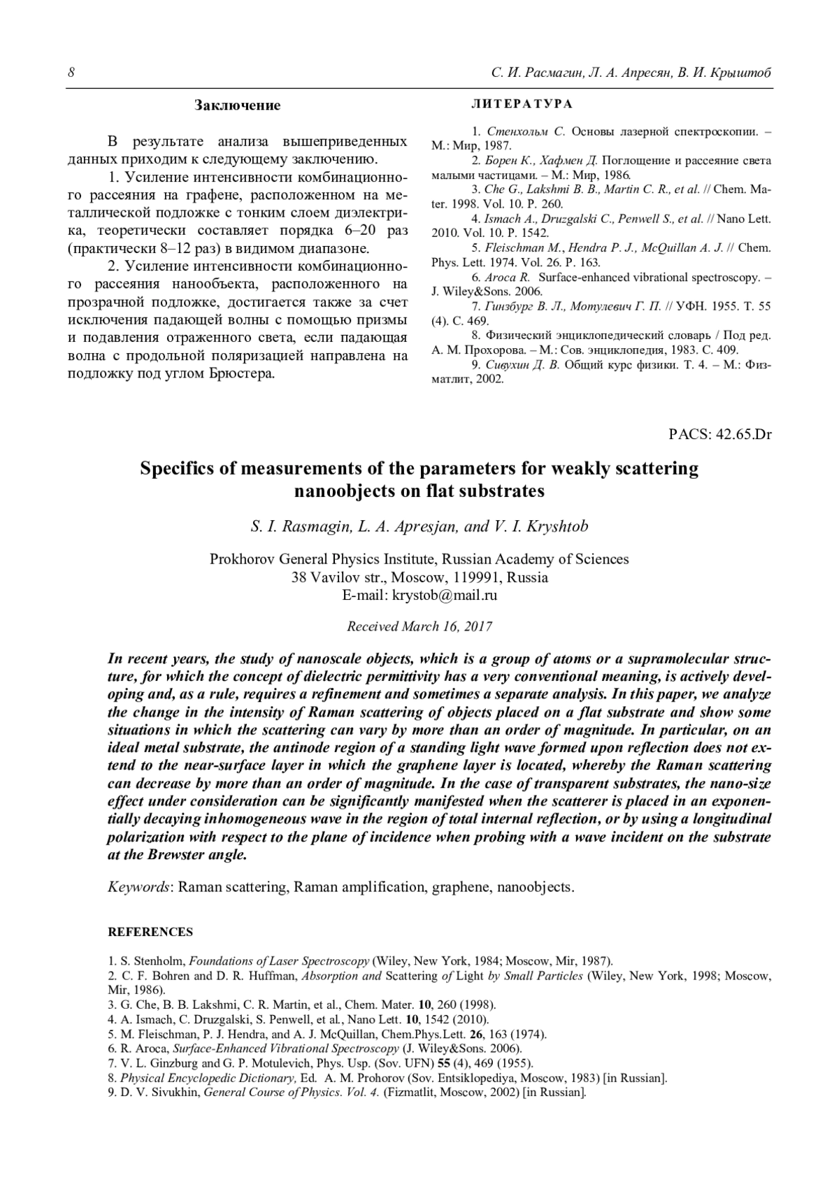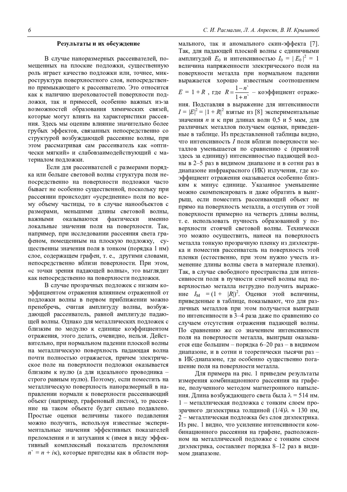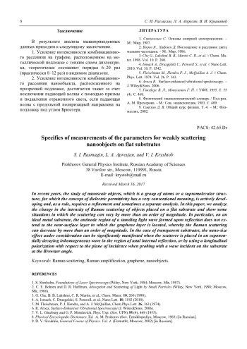В последние годы активно развиваются исследование наноразмерных объектов, представляющий собой группу атомов или супрамолекулярную структуру, для которых понятие диэлектрической проницаемости имеет весьма условный смысл и, как правило, требует уточнения, а иногда и отдельного анализа. В настоящей работе проанализировано изменение интенсивности комбинационного рассеяния объектов, помещенных на плоскую подложку, и показаны некоторые ситуации, в которых рассеяние может изменяться более чем на порядок. В частности, на идеальной металлической подложке область пучности стоячей световой волны, образованной при отражении, не распространяется на приповерхностный слой, в котором находится слой графена, за счет чего рамановское (комбинационное) рассеяние может уменьшиться более чем на порядок. В случае прозрачных подложек рассматриваемый наноразмерный эффект может значительно проявиться при помещении рассеивателя в экспоненциально затухающую неоднородную волну в области полного внутреннего отражения, либо при использовании продольной по отношению к плоскости падения поляризации при зондировании волной, падающей на подложку под углом Брюстера.
