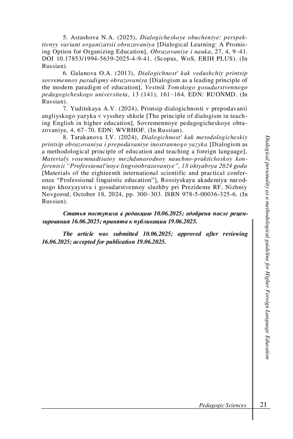 Материалы и методы. Основным теоретическим методом, использованным в ходе написания данной статьи, явился анализ философской, социологической, культурологической, психолого-педагогической, лингводидактической, лингвистической литературы, связанной с междисциплинарными понятиями диалога и диалогичности. Рассмотрение диалогичности в контексте иноязычного образования в педагогическом вузе опиралось на обобщение и интерпретацию обширного практического опыта работы авторов статьи в качестве преподавателей высшей школы.