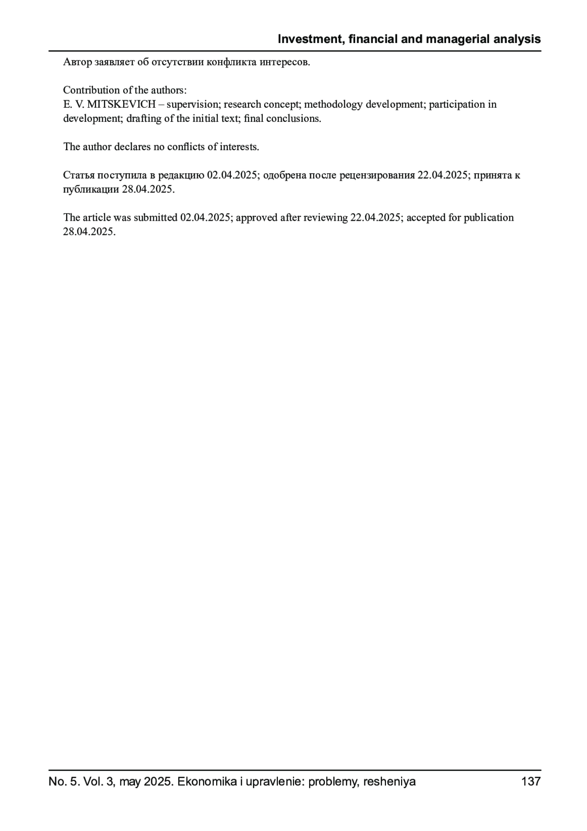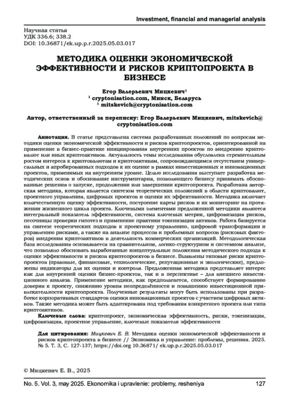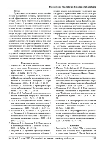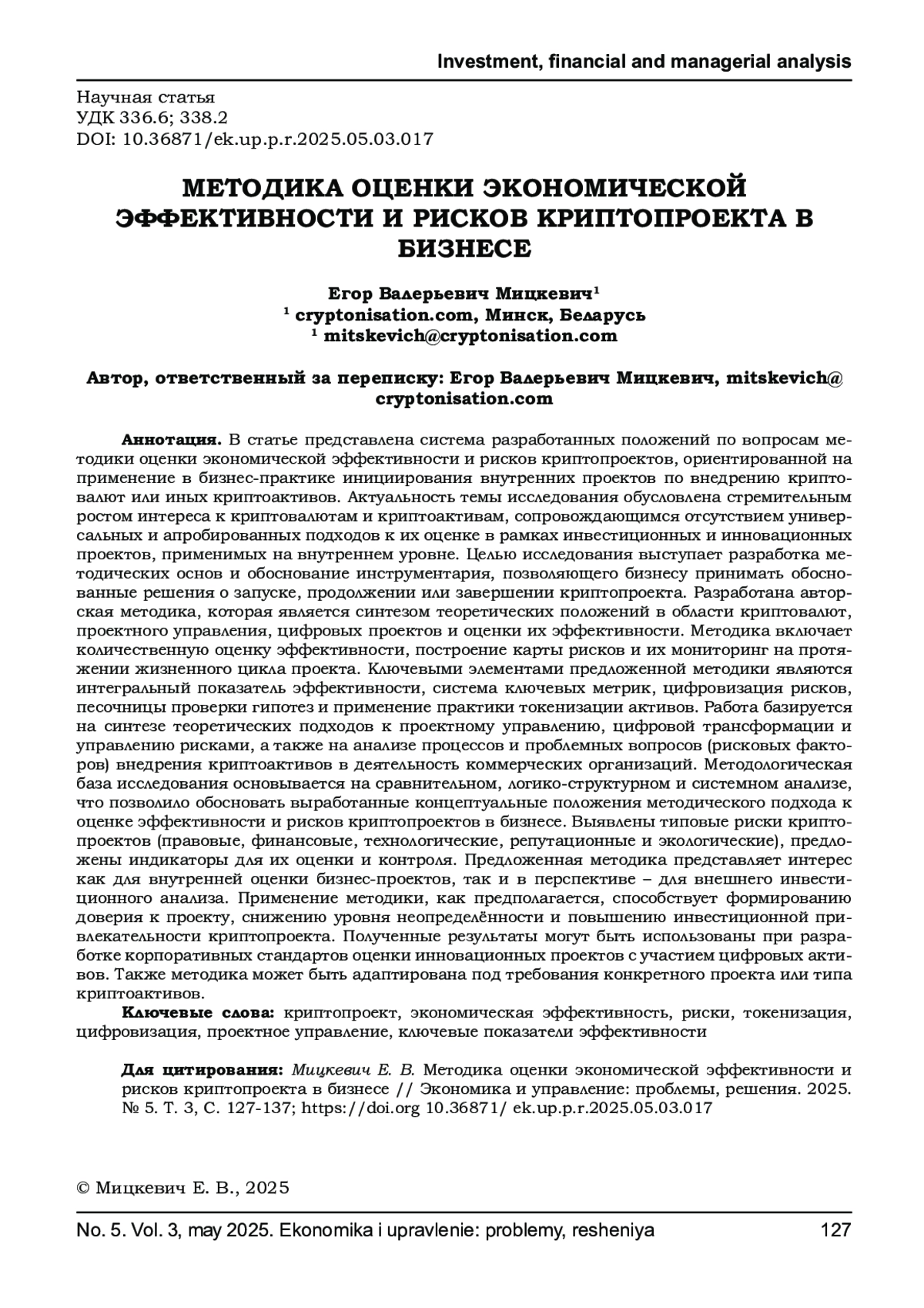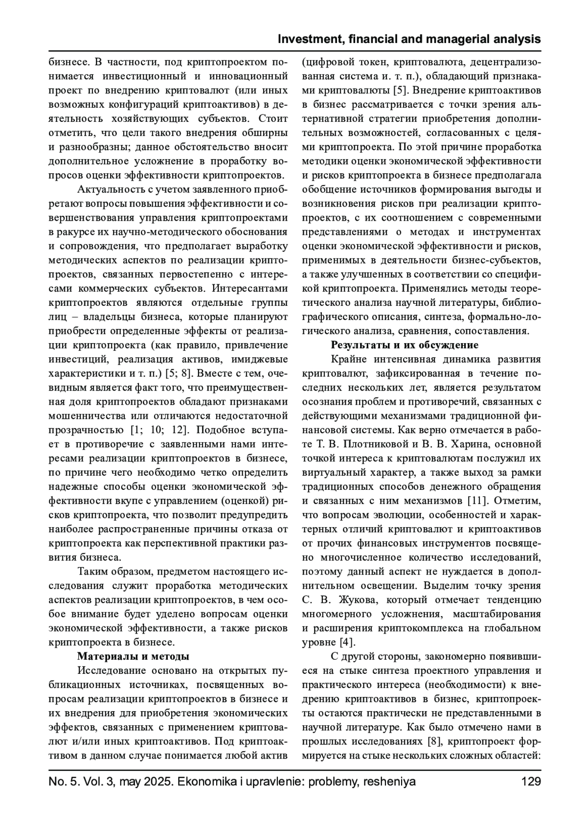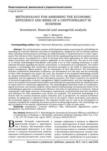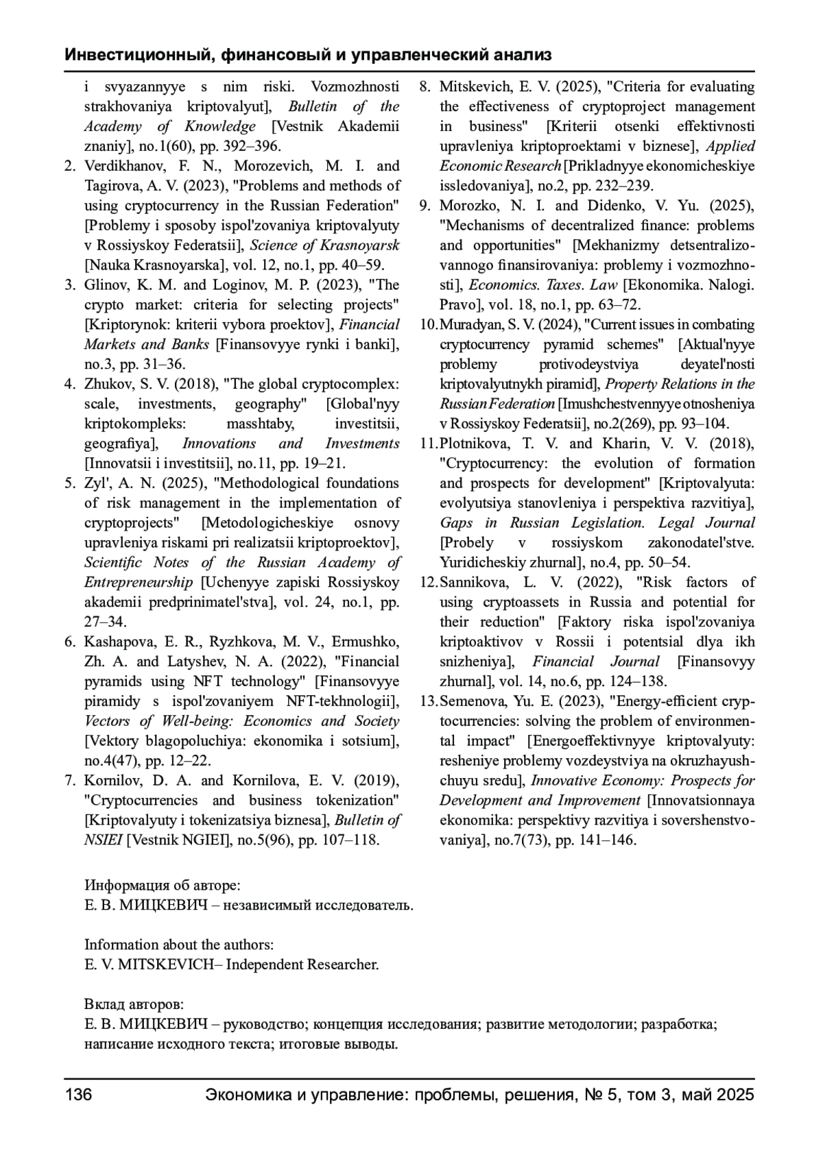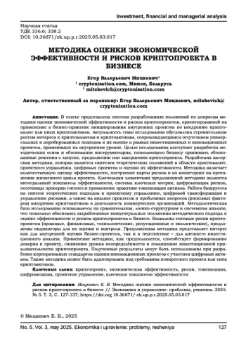 8. Мицкевич Е. В. Критерии оценки эффективности управления криптопроектами в бизнесе // Прикладные экономические исследования. - 2025. - № 2. - С. 232-239. EDN: EYQTHB