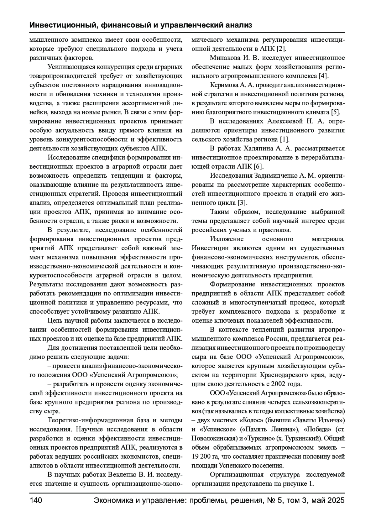 5. Минакова И. В., Кравченко Т. С., Бухвостов Ю. В., Галигузов В. И. Инвестиционное обеспечение малых форм хозяйствования регионального агропромышленного комплекса // Регион: системы, экономика, управление. - 2021. - № 2 (53). - С. 109-119. EDN: WWIISF