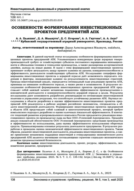 В данной научной статье исследованы особенности формирования инвестиционных проектов предприятий АПК. Усиливающаяся конкуренция среди аграрных товаропроизводителей требует от хозяйствующих субъектов постоянного наращивания инновационности и обновления техники и технологии производства, а также расширения ассортиментной линейки, выхода на новые рынки. В связи с этим формирование инвестиционных проектов принимает особую актуальность ввиду прямого влияния на уровень конкурентоспособности и эффективность деятельности хозяйствующих субъектов АПК. Исследование специфики формирования инвестиционных проектов в аграрной отрасли даёт возможность определить тенденции и факторы, оказывающие влияние на результативность инвестиционных стратегий. Проводя инвестиционный анализ, определяется оптимальный план реализации проектов АПК, принимая во внимание особенности отрасли, а также риски и возможности. В результате исследование особенностей формирования инвестиционных проектов предприятий АПК представляет собой важный элемент механизма повышения эффективности производственно-экономической деятельности и конкурентоспособности аграрной отрасли в целом. Результаты исследования дают возможность разработать рекомендации по оптимизации инвестиционной политики и управлению ресурсами, что способствует устойчивому развитию АПК. Научные исследования в области разработки и оценки эффективности инвестиционных проектов предприятий АПК реализуются в работах ведущих российских экономистов, специалистов в области инвестиционной деятельности. Формирование инвестиционных проектов предприятий в области АПК представляет собой сложный и многоступенчатый процесс, который требует комплексного подхода к разработке и оценке ключевых показателей эффективности. В контексте тенденций развития агропромышленного комплекса России предлагается реализация инвестиционного проекта по производству сыра на базе ООО «Успенский Агропромсоюз». Проведён анализ показателей обеспеченности ООО «Успенский Агропромсоюз» средствами производства и эффективности их использования, дана оценка эффективности использования оборотных средств. Проанализированы основные результаты деятельности предприятия. В результате разработан и проведена оценка экономической эффективности инвестиционного проекта. Таким образом, развитие инвестиционной деятельности, реализация инвестиционных проектов, а также применение механизмов поддержки инвестиций и стимулирования экономического роста предприятий АПК являются значимыми составляющими стратегии социально-экономического развития продовольственной безопасности.