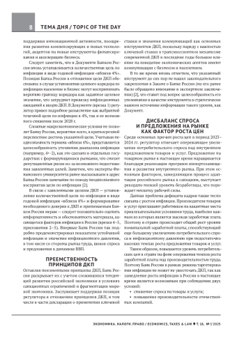 В «Основных направлениях единой государст - венной денежно-кредитной политики на 2025 год и период 2026 и 2027 годов», одобренных Советом директоров Банка России 30 октября 2024 г. 1 (далее — Документ), традиционно излагается позиция регулятора относительно текущего состояния экономики и прогнозов ее развития в среднесрочной перспективе для последующего формирования целей и подходов к проведению денежно-кредитной политики (далее — ДКП) в 2025–2027 гг.