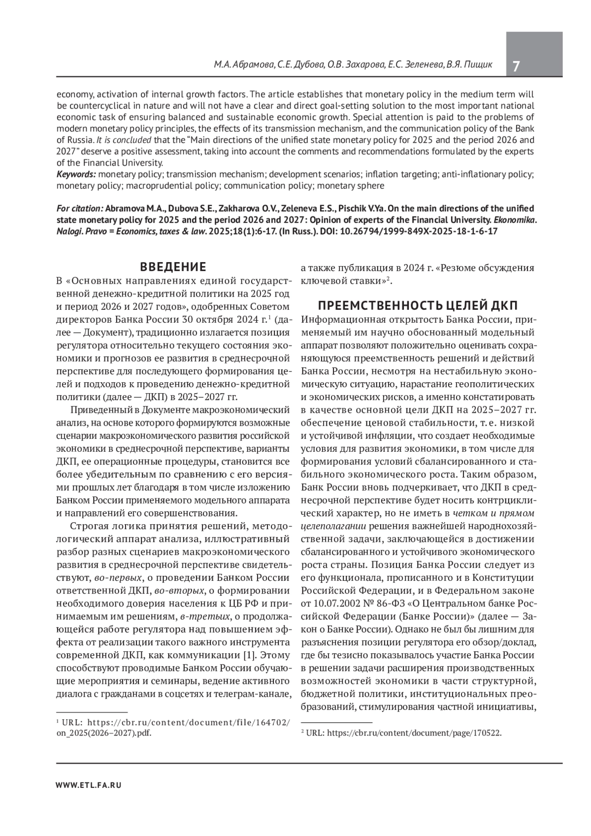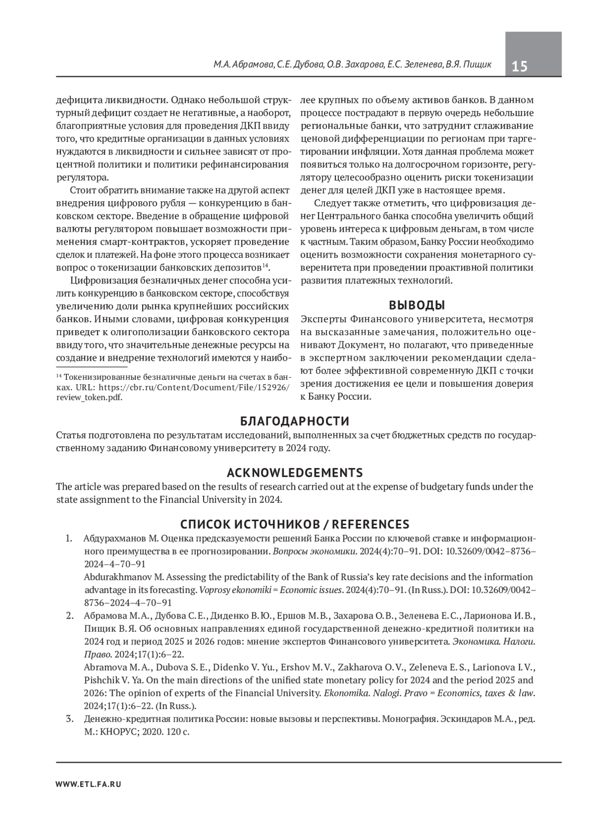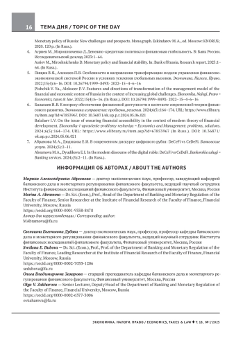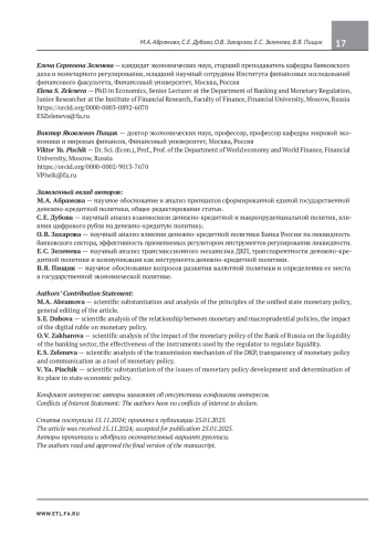 2. Абрамова М. А., Дубова С. Е., Диденко В. Ю., Ершов М. В., Захарова О. В., Зеленева Е. С., Ларионова И. В., Пищик В. Я. Об основных направлениях единой государственной денежно-кредитной политики на 2024 год и период 2025 и 2026 годов: мнение экспертов Финансового университета. Экономика. Налоги. Право. 2024;17(1):6-22. EDN: SZRGLE