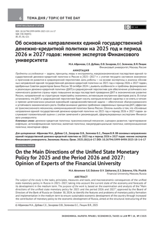 Предметы исследования — задачи, принципы, меры и инструменты, макроэкономические последствия единой государственной денежно-кредитной политики в России в 2025–2027 гг. с учетом текущего состояния экономики и прогнозов ее развития в среднесрочной перспективе. Цель работы — на основе экспертизы и анализа «Основных направлений единой государственной денежно-кредитной политики на 2025 год и период 2026 и 2027 годов», одобренных Советом директоров Банка России 30 октября 2024 г., выявить особенности и проблемы формирования и реализации денежно-кредитной политики (ДКП) в среднесрочной перспективе для обеспечения устойчивого экономического развития страны через повышение вклада последствий проведения ДКП в экономическое развитие России, направленной на структурную перестройку экономики, активизацию внутренних факторов роста. В статье установлено, что ДКП в среднесрочной перспективе будет носить контрциклический характер и не иметь в четком и прямом целеполагании решения важнейшей народнохозяйственной задачи — обеспечение сбалансированного и устойчивого экономического роста. Особое внимание уделено проблемам современных принципов ДКП, эффектам ее трансмиссионного механизма, коммуникационной политики Банка России. Сделаны выводы о том, что «Основные направления единой государственной денежно-кредитной политики на 2025 год и период 2026 и 2027 годов» заслуживают положительной оценки с учетом замечаний и рекомендаций, сформулированных экспертами Финансового университета