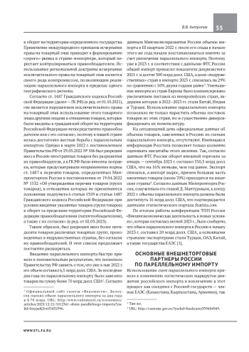 В условиях усиления санкционного давления на Россию и ухода многих иностранных брендов с российского рынка актуальной формой осуществления внешнеторговой деятельности стал параллельный импорт, заключающийся во ввозе в страну оригинальной продукции без согласия ее правообладателя или производителя в обход прямых поставок. Причем параллельный импорт не является чем-то новым для России, поскольку он применялся еще до его законодательного запрета в 2002 г., 1 когда ввозить в страну товар, у которого есть товарный знак, можно было только с разрешения его вла - дельца, а заниматься импортом продукции крупных брендов могли только их правообладатели, аффилированные с ними лица или официальные дилеры. Однако для усиления инвестиционной привлекательности нашей страны и привлечения в Россию крупных зарубежных компаний было принято решение отказаться от практики параллельного импорта и разрешить ввоз в страну товаров только с разрешения правообладателя.