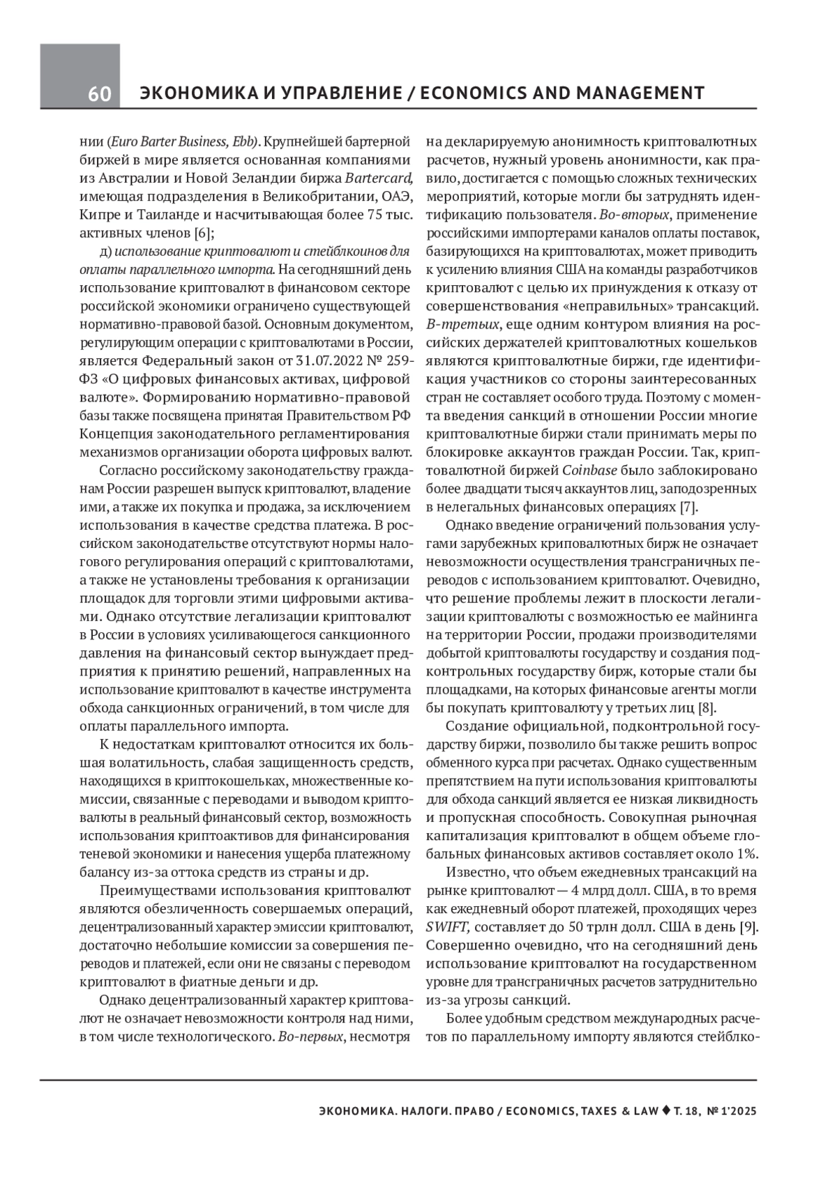 7. Индустриев М. А. Перспективы использования криптовалют как инструмента обхода международных санкций. Гуманитарные науки в новой реальности: проблемы, подходы, ценности. Саратов; 2022. С. 557. EDN: PGZUDH