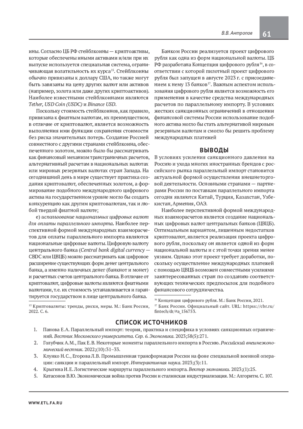 8. Попова Е. М., Степкина Ю. А., Соловьев Н. А. Трансграничные платежи в криптовалюте в современных условиях. Финансы, деньги, инвестиции. 2023;(2):12. EDN: XDZVXW