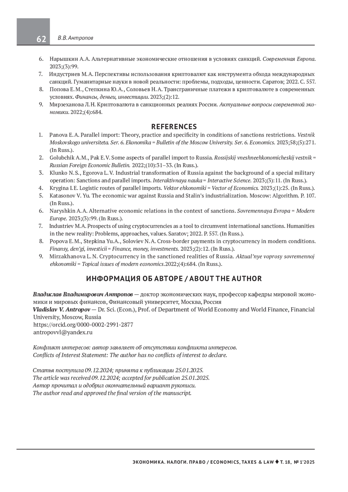 1. Панова Е. А. Параллельный импорт: теория, практика и специфика в условиях санкционных ограничений. Вестник Московского университета. Сер. 6. Экономика. 2023;58(5):271.