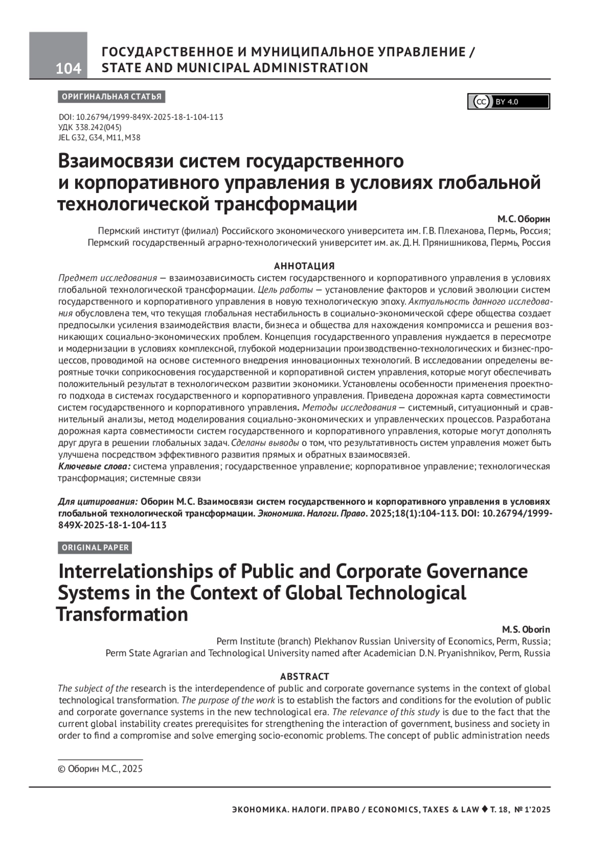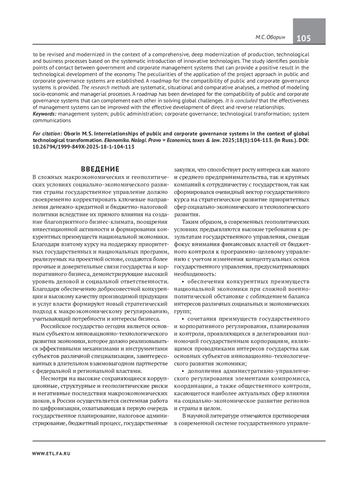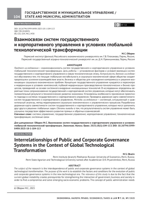 Предмет исследования — взаимозависимость систем государственного и корпоративного управления в условиях глобальной технологической трансформации. Цель работы — установление факторов и условий эволюции систем государственного и корпоративного управления в новую технологическую эпоху. Актуальность данного исследования обусловлена тем, что текущая глобальная нестабильность в социально-экономической сфере общества создает предпосылки усиления взаимодействия власти, бизнеса и общества для нахождения компромисса и решения возникающих социально-экономических проблем. Концепция государственного управления нуждается в пересмотре и модернизации в условиях комплексной, глубокой модернизации производственно-технологических и бизнес-процессов, проводимой на основе системного внедрения инновационных технологий. В исследовании определены вероятные точки соприкосновения государственной и корпоративной систем управления, которые могут обеспечивать положительный результат в технологическом развитии экономики. Установлены особенности применения проектного подхода в системах государственного и корпоративного управления. Приведена дорожная карта совместимости систем государственного и корпоративного управления. Методы исследования — системный, ситуационный и сравнительный анализы, метод моделирования социально-экономических и управленческих процессов. Разработана дорожная карта совместимости систем государственного и корпоративного управления, которые могут дополнять друг друга в решении глобальных задач. Сделаны выводы о том, что результативность систем управления может быть улучшена посредством эффективного развития прямых и обратных взаимосвязей