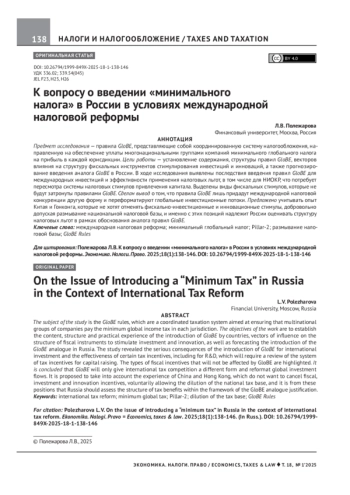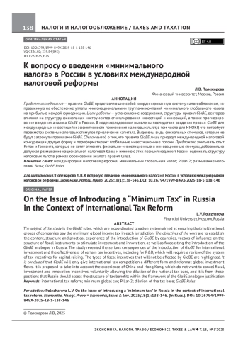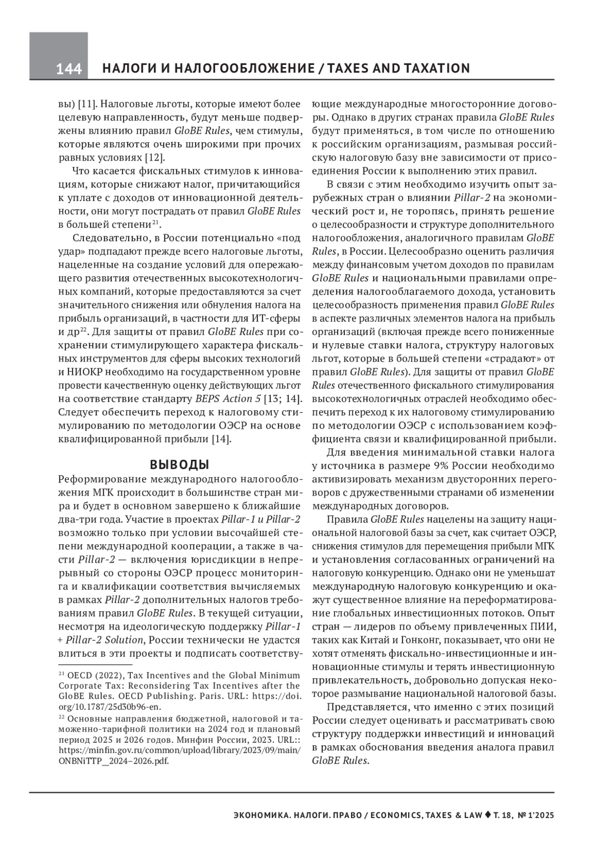 Предмет исследования — правила GloBE, представляющие собой координированную систему налогообложения, направленную на обеспечение уплаты многонациональными группами компаний минимального глобального налога на прибыль в каждой юрисдикции. Цели работы — установление содержания, структуры правил GloBE, векторов влияния на структуру фискальных инструментов стимулирования инвестиций и инноваций, а также прогнозирование введения аналога GloBE в России. В ходе исследования выявлены последствия введения правил GloBE для международных инвестиций и эффективности применения налоговых льгот, в том числе для НИОКР, что потребует пересмотра системы налоговых стимулов привлечения капитала. Выделены виды фискальных стимулов, которые не будут затронуты правилами GloBE. Сделан вывод о том, что правила GloBE лишь придадут международной налоговой конкуренции другую форму и переформатируют глобальные инвестиционные потоки. Предложено учитывать опыт Китая и Гонконга, которые не хотят отменять фискально-инвестиционные и инновационные стимулы, добровольно допуская размывание национальной налоговой базы, и именно с этих позиций надлежит России оценивать структуру налоговых льгот в рамках обоснования аналога правил GloBE.
