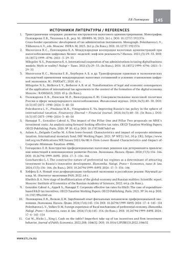 1. Трансграничные операции: развитие инструментов налогового администрирования. Монография. Полежарова Л. В., Тихонова А. В., ред. М.: ИНФРА-М; 2023. 261 с. DOI: 10.12737/1921376