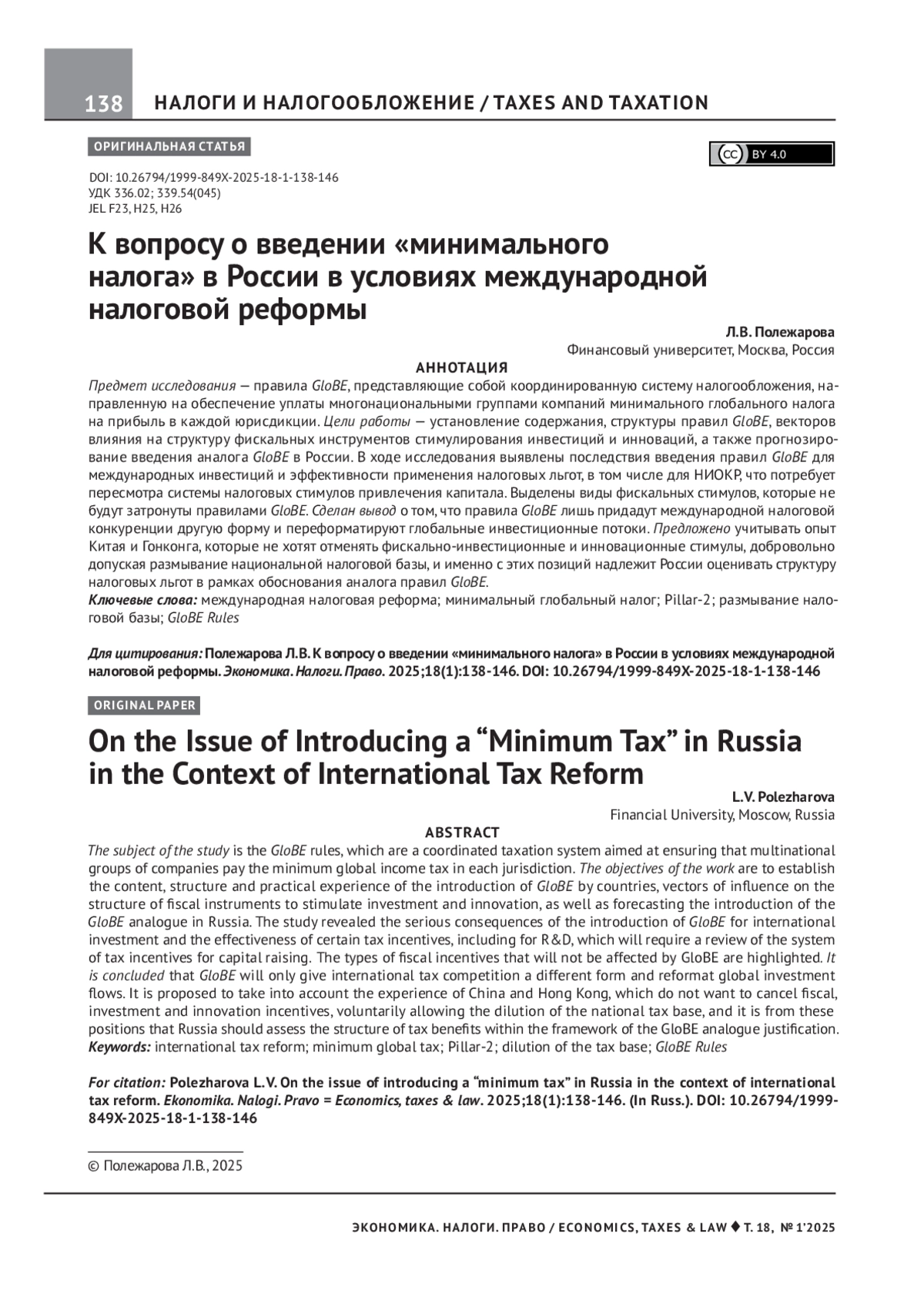 4. Полежарова Л. В., Пинская М. Р., Виноградова Е. Ю. Совершенствование налоговой политики России в сфере международного налогообложения. Финансовый журнал. 2024;16(3):40-50. DOI: 10.31107/2075-1990-2024-3-40-50 EDN: GYVRFD