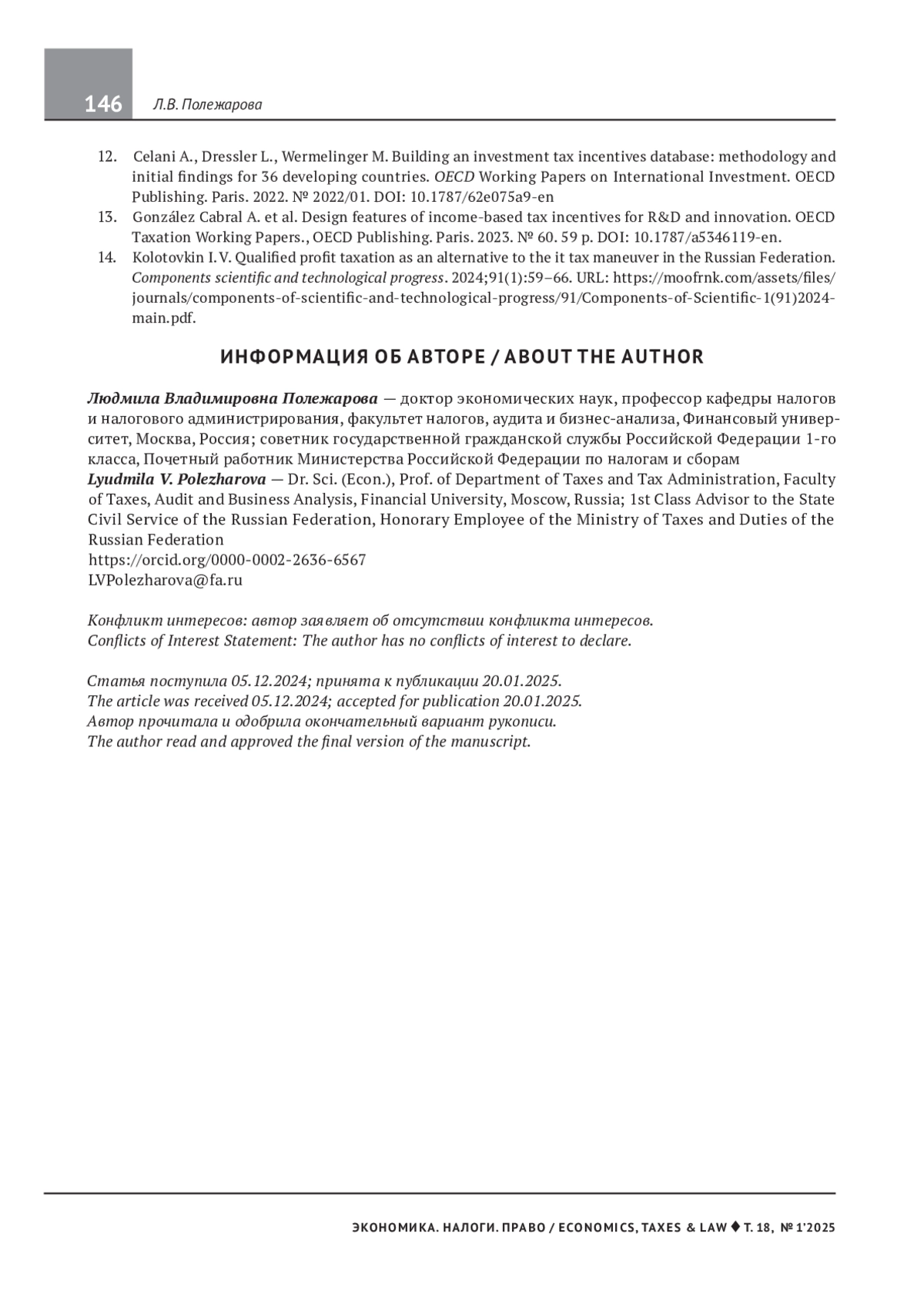 7. Гончаренко Л. И. Конструктив преференциальных налоговых режимов как детерминанта привлечения инвестиций в инновационное развитие России. Экономика. Налоги. Право. 2024;17(3):156-166. 10.26794/1999-849X- 2024-17-3-156-166. DOI: 10.26794/1999-849X-2024-17-3-156-166 EDN: QQYEJM