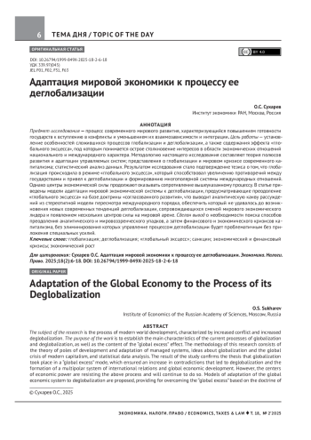 Предмет исследования — процесс современного мирового развития, характеризующийся повышением готовности государств к вступлению в конфликты и уменьшением их взаимозависимости и интеграции. Цель работы — установление особенностей сложившихся процессов глобализации и деглобализации, а также содержания эффекта «глобального эксцесса», под которым понимается острое столкновение интересов в области экономических отношений национального и международного характера. Методологию настоящего исследования составляют теория полюсов развития и адаптации управляемых систем; представления о глобализации и мировом кризисе современного капитализма; статистический анализ данных. Результатом исследования стало подтверждение тезиса о том, что глобализация происходила в режиме «глобального эксцесса», который способствовал увеличению противоречий между государствами и привел к деглобализации и формированию многополярной системы международных отношений. Однако центры экономической силы продолжают оказывать сопротивление вышеуказанному процессу. В статье приведены модели адаптации мировой экономической системы к деглобализации, предусматривающие преодоление «глобального эксцесса» на базе доктрины «согласованного развития», что выводит аналитическую канву рассуждений из стереотипной модели пересмотра международного порядка, обеспечить который не удавалось до возник - новения новых современных тенденций деглобализации, сопровождающихся сменой мирового экономического лидера и появлением нескольких центров силы на мировой арене. Сделан вывод о необходимости поиска способов преодоления аналитического и мировоззренческого упадков, а затем финансового и экономического кризисов капитализма, без элиминирования которых управление процессом деглобализации будет проблематичным без приложения специальных усилий