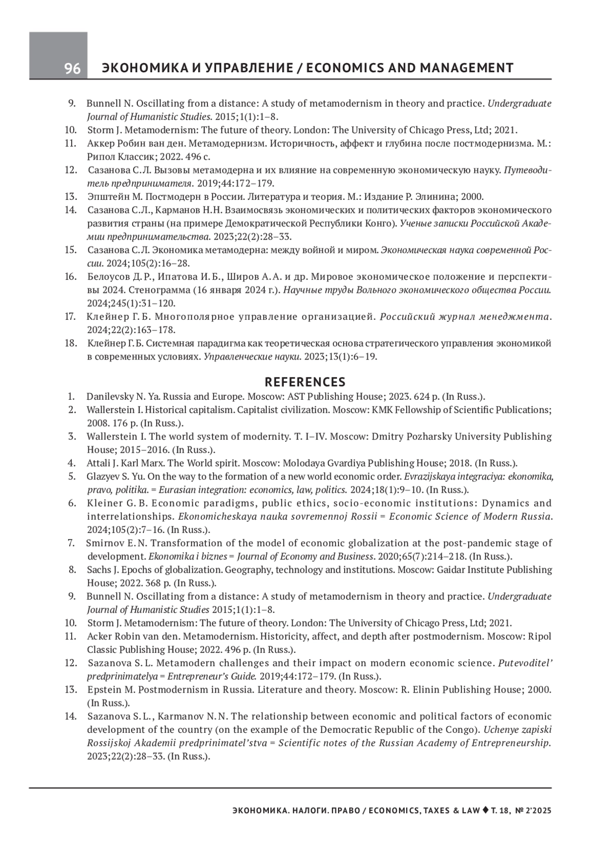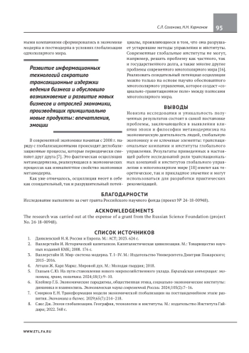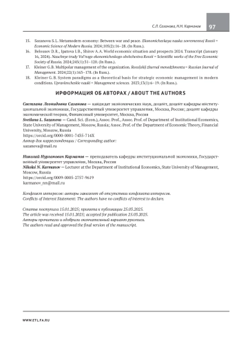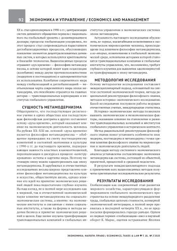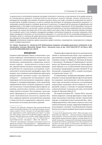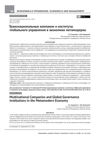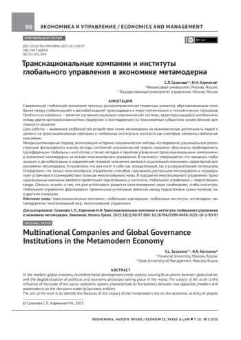 САЗАНОВА С. Л., ДРАГУНОВ Н. Н. ТРАНСНАЦИОНАЛЬНЫЕ КОМПАНИИ И ИНСТИТУТЫ ГЛОБАЛЬНОГО УПРАВЛЕНИЯ В ЭКОНОМИКЕ МЕТАМОДЕРНА // ЭКОНОМИКА. НАЛОГИ. ПРАВО. 2025. Т. 18 № 2