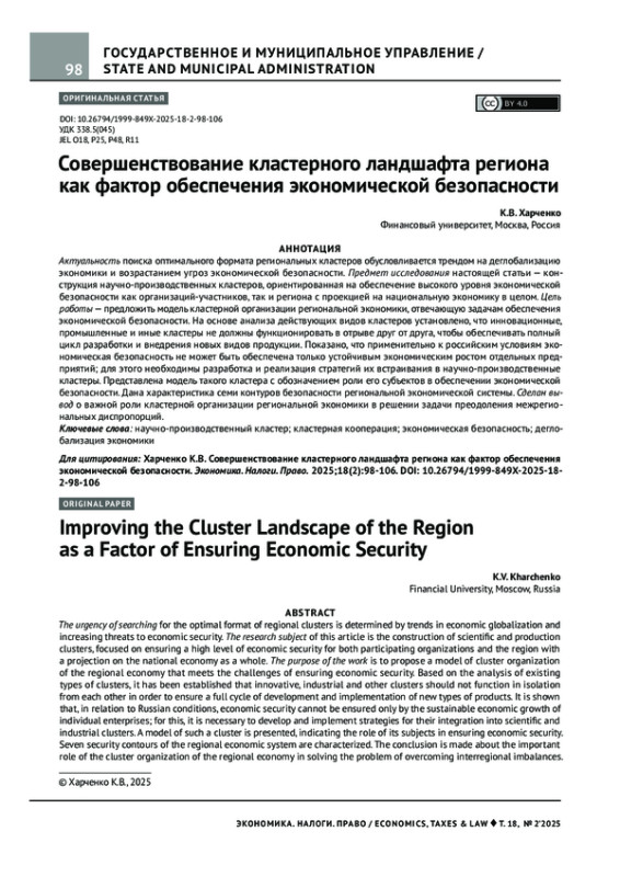 ХАРЧЕНКО К. В. СОВЕРШЕНСТВОВАНИЕ КЛАСТЕРНОГО ЛАНДШАФТА РЕГИОНА КАК ФАКТОР ОБЕСПЕЧЕНИЯ ЭКОНОМИЧЕСКОЙ БЕЗОПАСНОСТИ // ЭКОНОМИКА. НАЛОГИ. ПРАВО. 2025. Т. 18 № 2