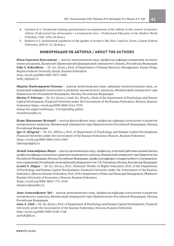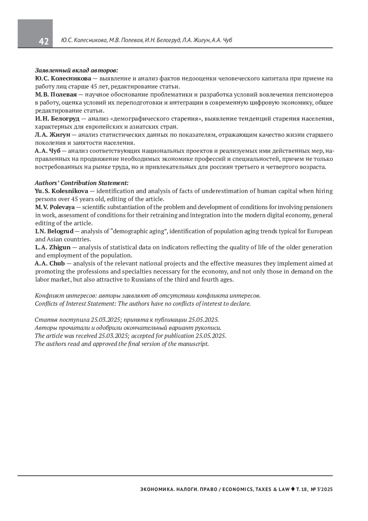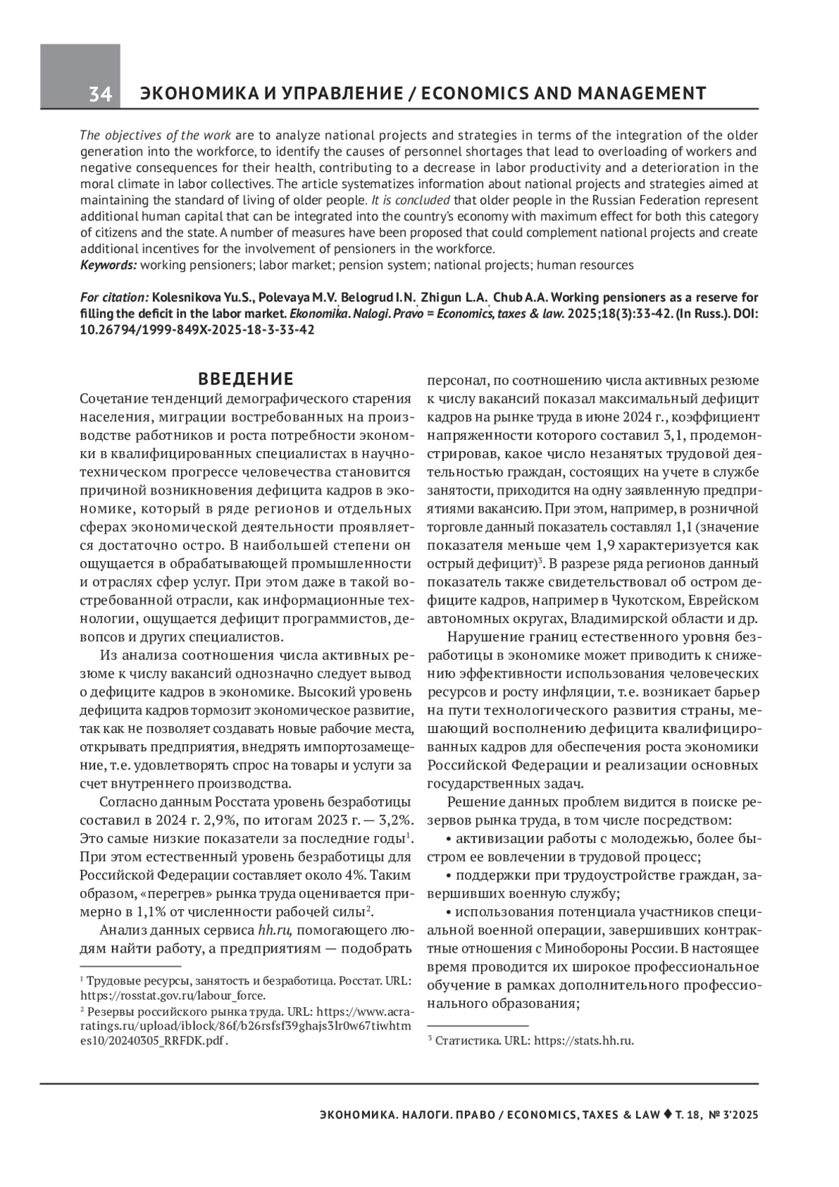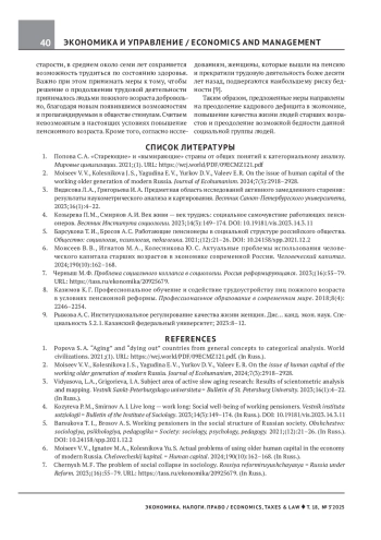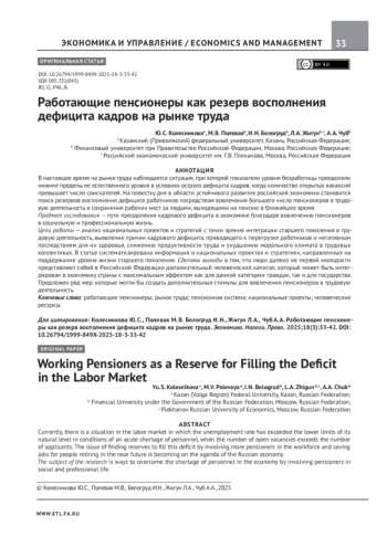 КОЛЕСНИКОВА Ю. С., ПОЛЕВАЯ М. В., БЕЛОГРУД И. Н., ЖИГУН Л. А., ЧУБ А. А. РАБОТАЮЩИЕ ПЕНСИОНЕРЫ КАК РЕЗЕРВ ВОСПОЛНЕНИЯ ДЕФИЦИТА КАДРОВ НА РЫНКЕ ТРУДА // ЭКОНОМИКА. НАЛОГИ. ПРАВО. 2025. Т. 18 № 3