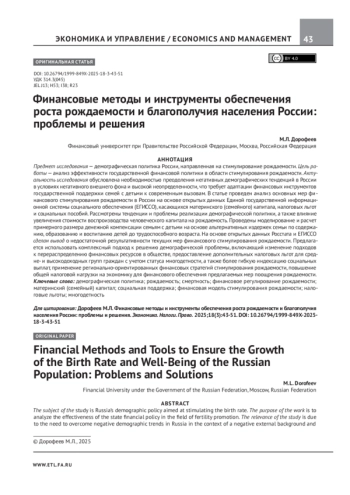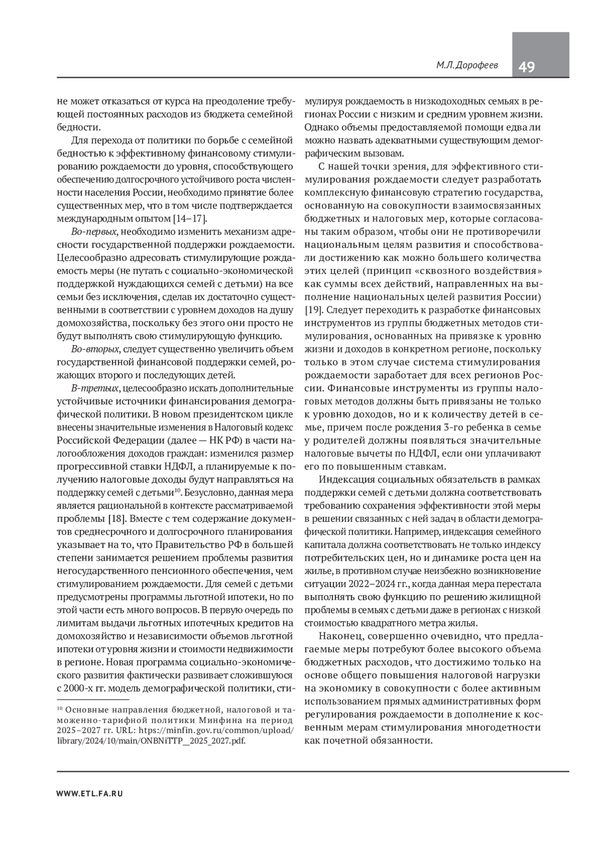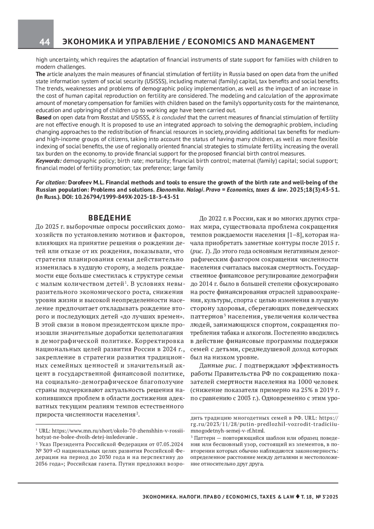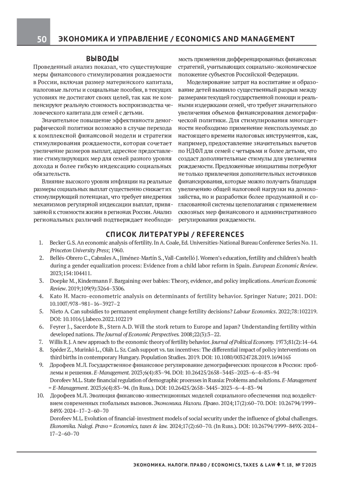 9. Дорофеев М. Л. Государственное финансовое регулирование демографических процессов в России: проблемы и решения. E-Management. 2023;6(4):83-94. DOI: 10.26425/2658-3445-2023-6-4-83-94 EDN: QQVXAJ