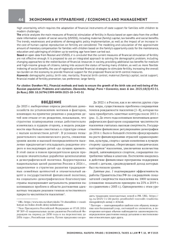 Предмет исследования — демографическая политика России, направленная на стимулирование рождаемости. Цель работы — анализ эффективности государственной финансовой политики в области стимулирования рождаемости. Актуальность исследования обусловлена необходимостью преодоления негативных демографических тенденций в России в условиях негативного внешнего фона и высокой неопределенности, что требует адаптации финансовых инструментов государственной поддержки семей с детьми к современным вызовам. В статье проведен анализ основных мер финансового стимулирования рождаемости в России на основе открытых данных Единой государственной информационной системы социального обеспечения (ЕГИССО), касающихся материнского (семейного) капитала, налоговых льгот и социальных пособий. Рассмотрены тенденции и проблемы реализации демографической политики, а также влияние увеличения стоимости воспроизводства человеческого капитала на рождаемость. Проведены моделирование и расчет примерного размера денежной компенсации семьям с детьми на основе альтернативных издержек семьи по содержанию, образованию и воспитанию детей до трудоспособного возраста. На основе открытых данных Росстата и ЕГИССО сделан вывод о недостаточной результативности текущих мер финансового стимулирования рождаемости. Предлагается использовать комплексный подход к решению демографической проблемы, включающий изменение подходов к перераспределению финансовых ресурсов в обществе, предоставление дополнительных налоговых льгот для средне- и высокодоходных групп граждан с учетом статуса многодетности, а также более гибкую индексацию социальных выплат, применение регионально-ориентированных финансовых стратегий стимулирования рождаемости, повышение общей налоговой нагрузки на экономику для финансового обеспечения предлагаемых мер поощрения рождаемости