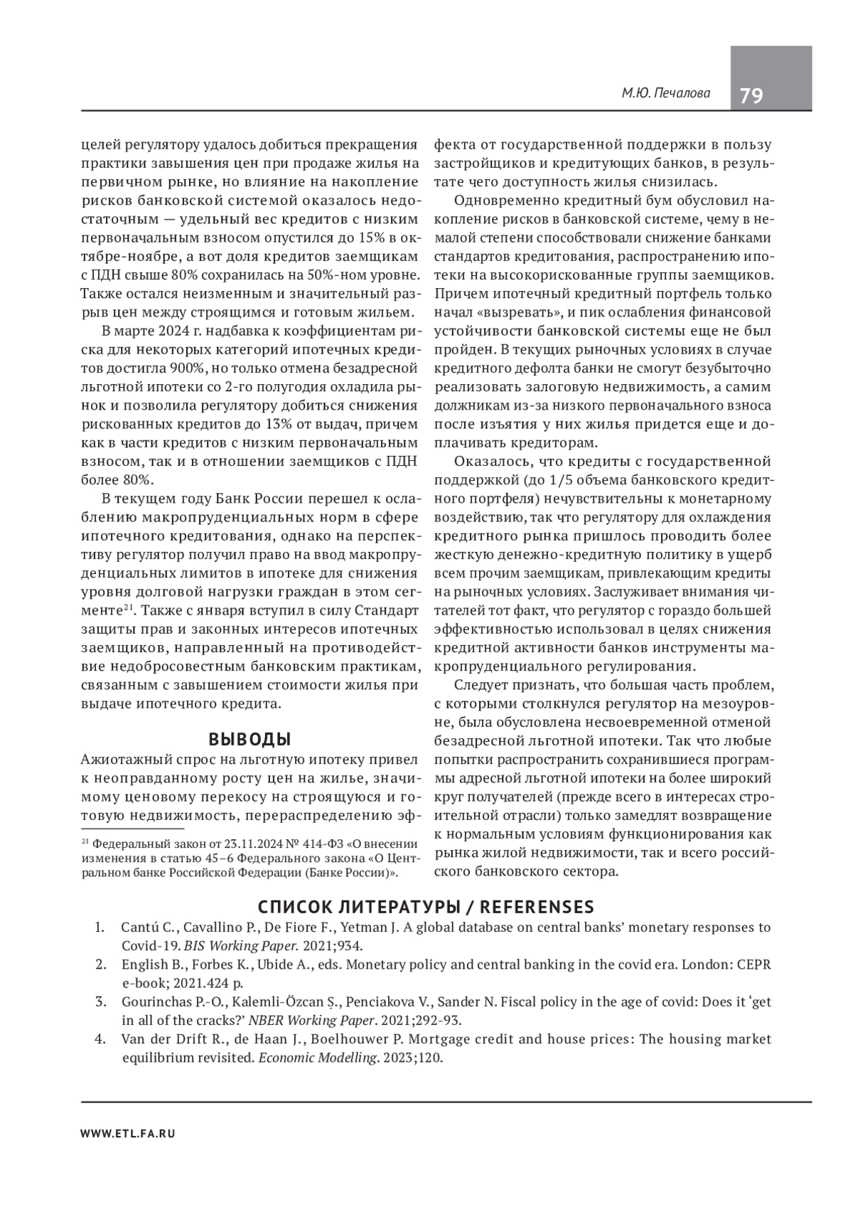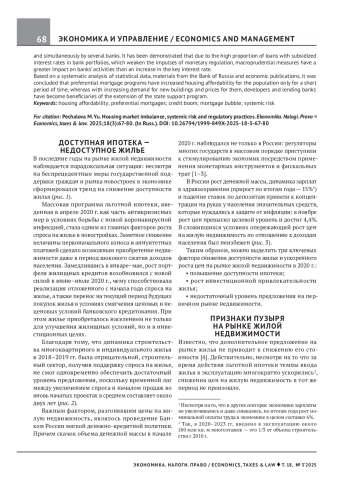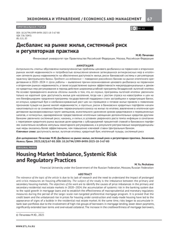 ПЕЧАЛОВА М. Ю. ДИСБАЛАНС НА РЫНКЕ ЖИЛЬЯ, СИСТЕМНЫЙ РИСК И РЕГУЛЯТОРНАЯ ПРАКТИКА // ЭКОНОМИКА. НАЛОГИ. ПРАВО. 2025. Т. 18 № 3