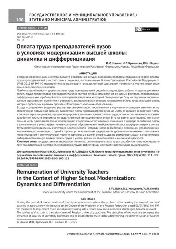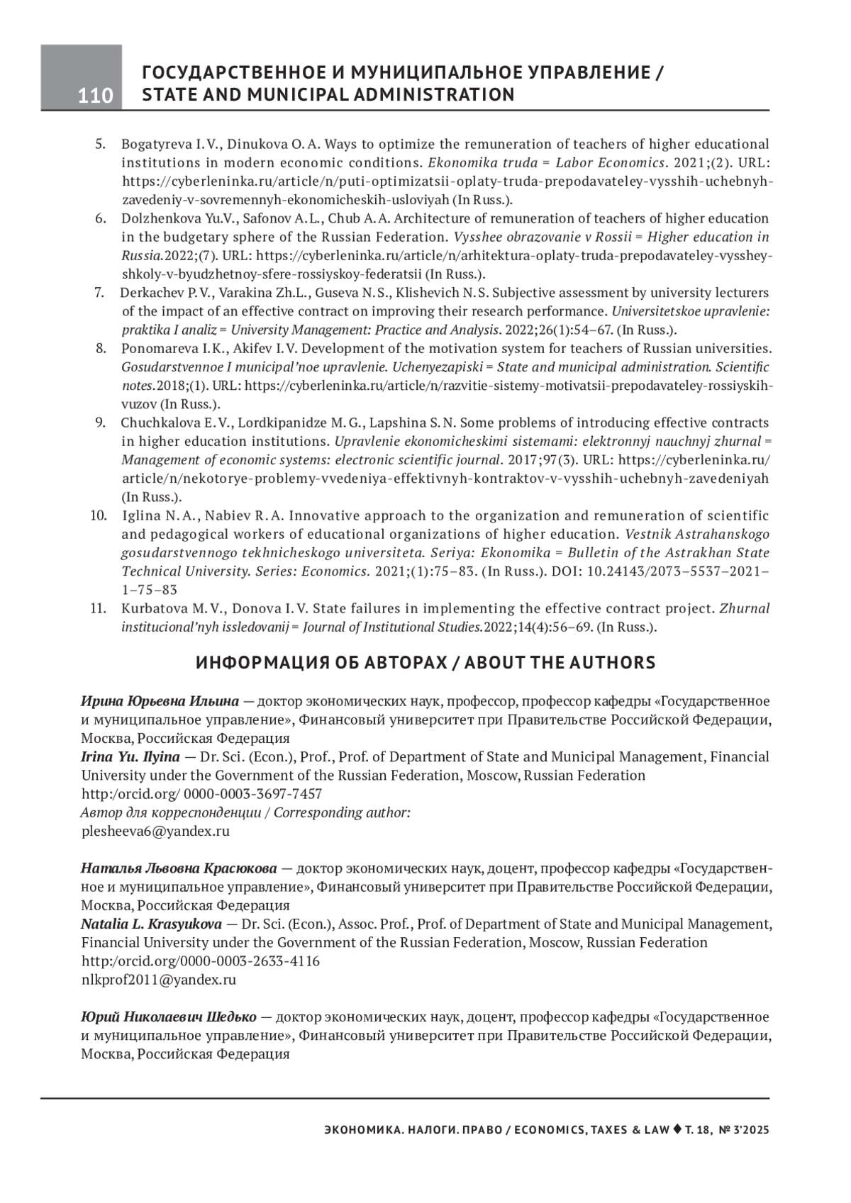 7. Деркачев П. В., Варакина Ж. Л., Гусева Н. С., Клишевич Н. С. Субъективная оценка преподавателями вузов влияния эффективного контракта на повышение показателей их научно-исследовательской работы.Университетское управление: практика и анализ.2022;26(1):54-67. EDN: AMHQPU