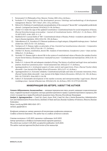 9. Велиева Д. С. Проблемы конституционной концептуализации понятия “достойная жизнь”. Ленинградский юридический журнал. 2014;36(2):74-84. EDN: STALKV