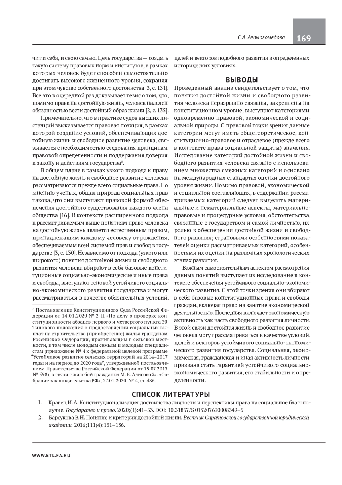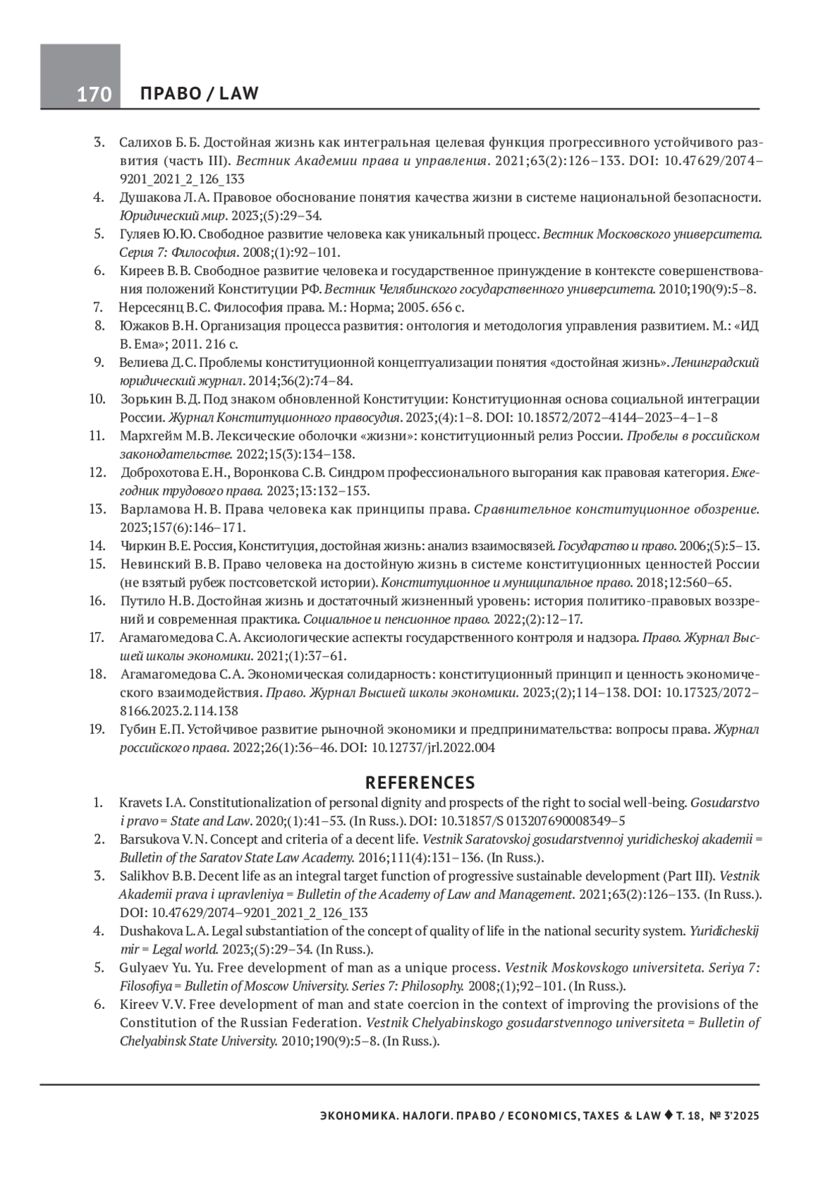 2. Барсукова В. Н. Понятие и критерии достойной жизни. Вестник Саратовской государственной юридической академии. 2016;111(4):131-136.
