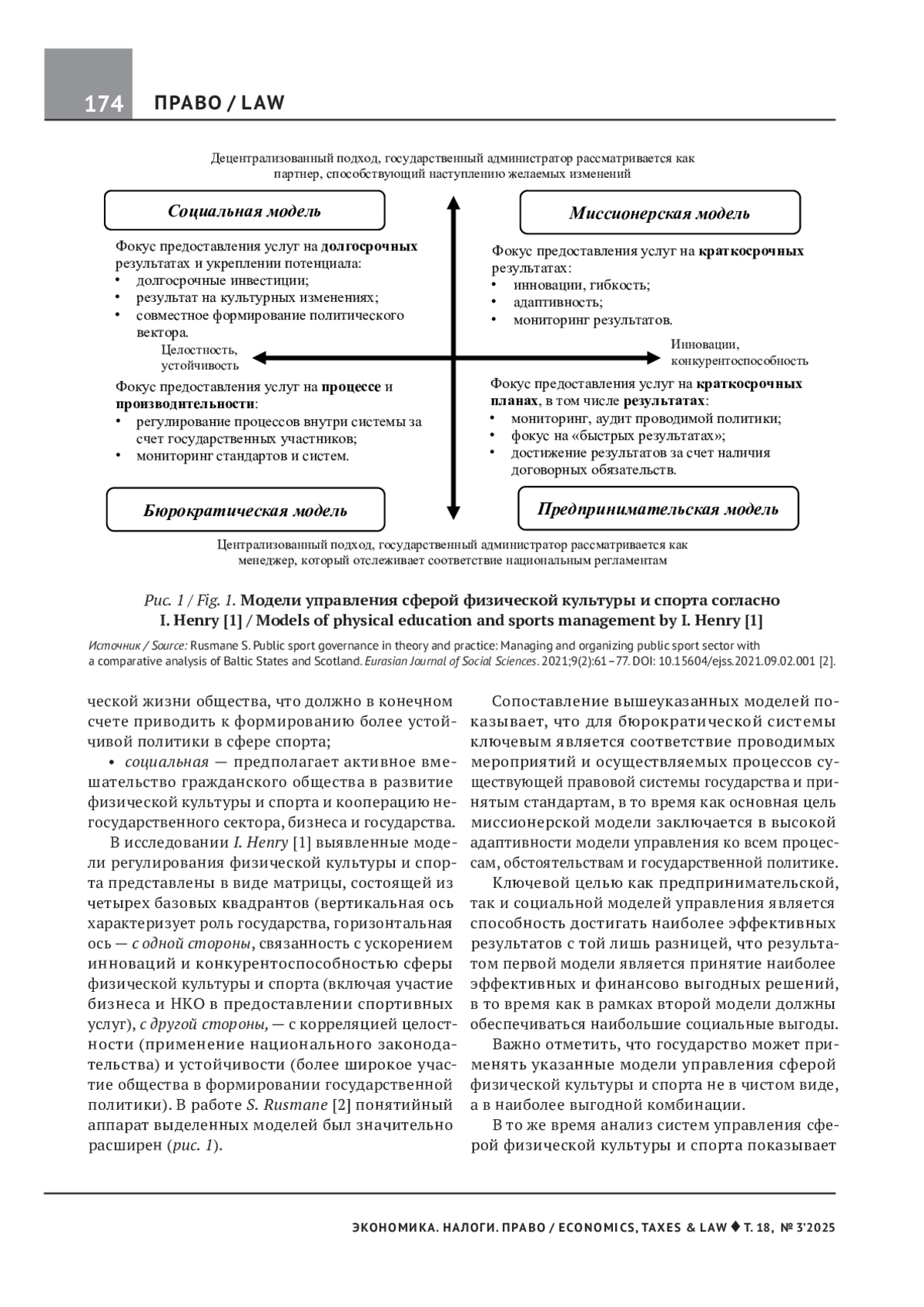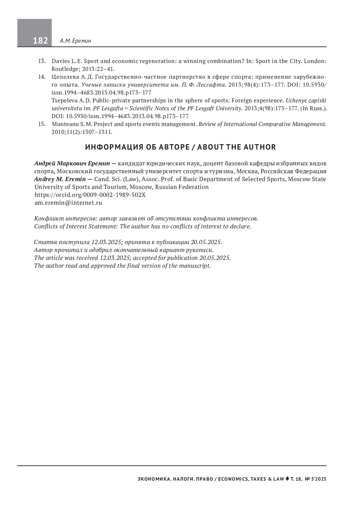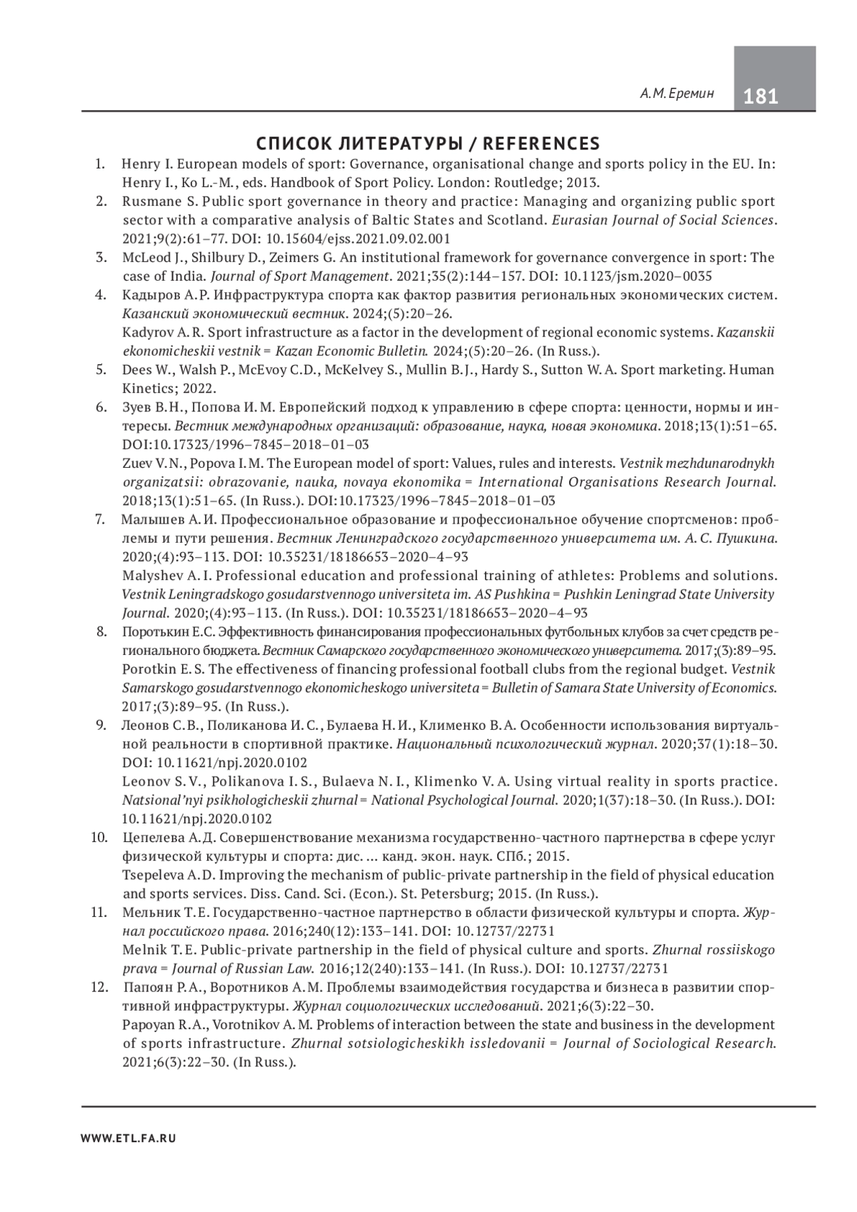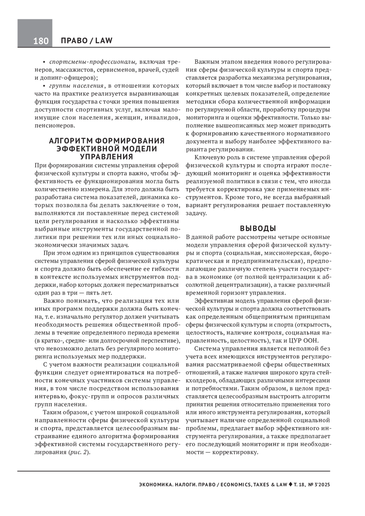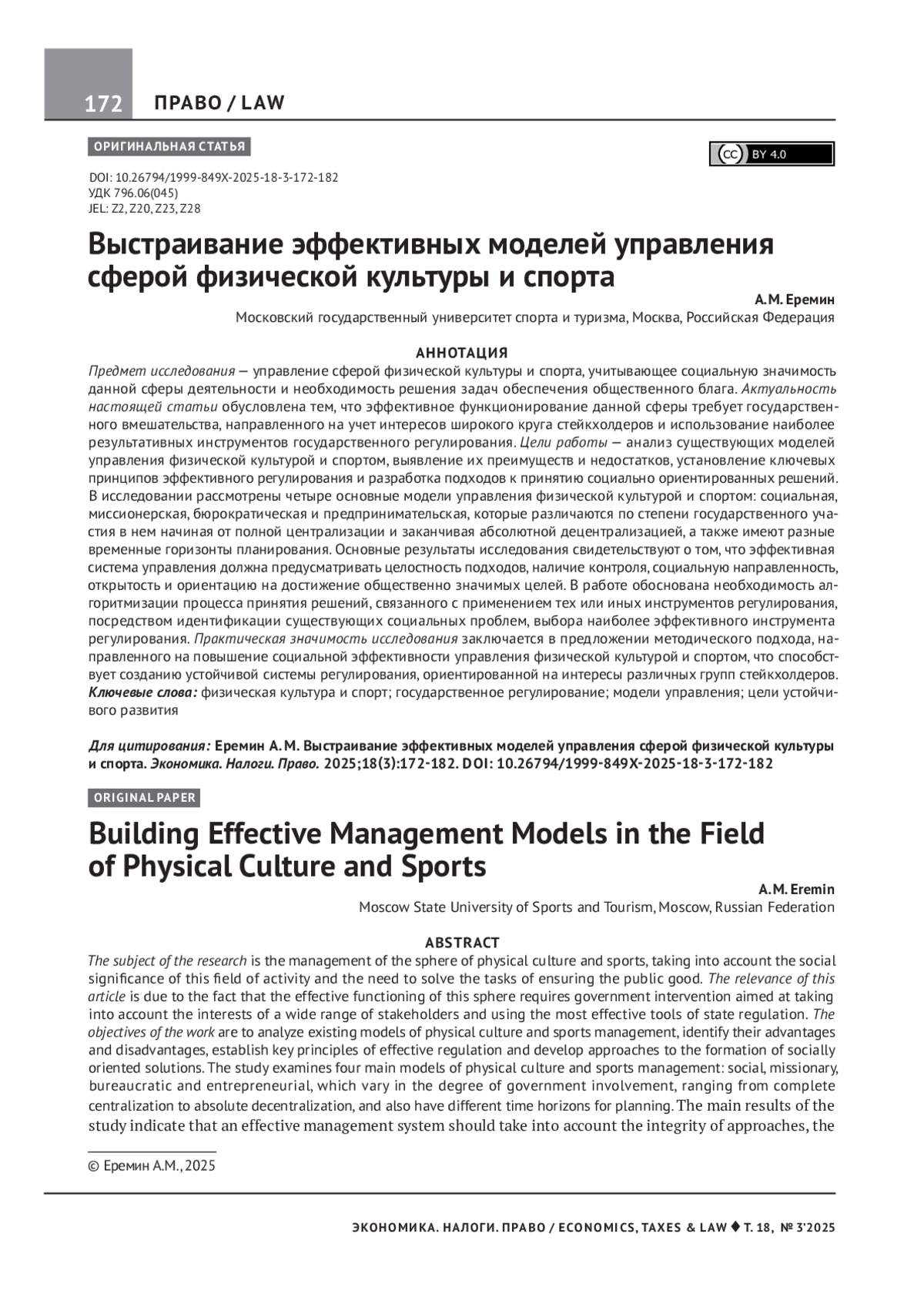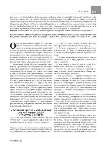 ЕРЕМИН А. М. ВЫСТРАИВАНИЕ ЭФФЕКТИВНЫХ МОДЕЛЕЙ УПРАВЛЕНИЯ СФЕРОЙ ФИЗИЧЕСКОЙ КУЛЬТУРЫ И СПОРТА // ЭКОНОМИКА. НАЛОГИ. ПРАВО. 2025. Т. 18 № 3