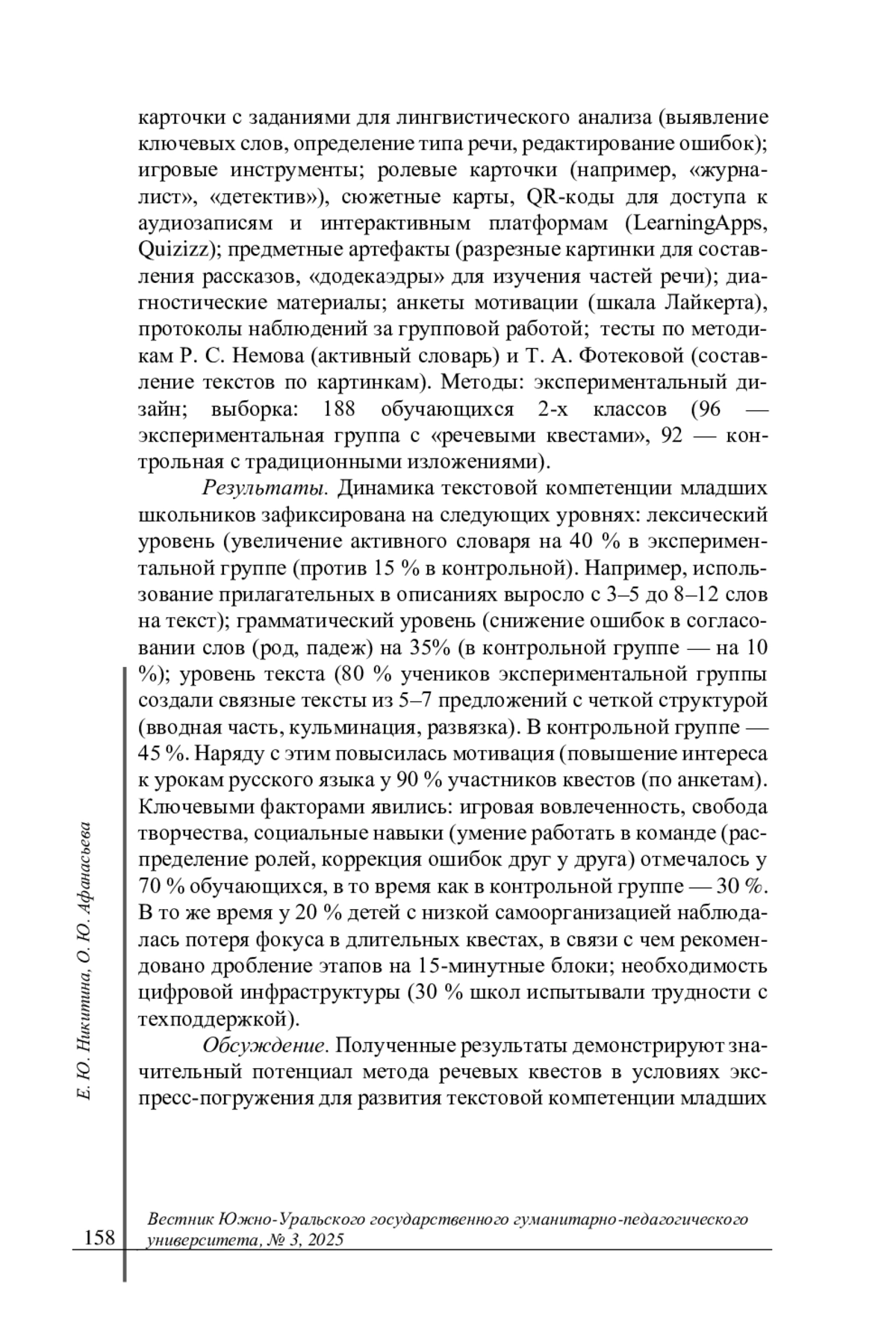 Материалы и методы. Материалы: текстовые ресурсы; литературные и публицистические тексты (А. С. Пушкин, К. Г. Паустовский), адаптированные для начальной школы, с акцентом на разнообразие стилей, лексики и синтаксических конструкций; карточки с заданиями для лингвистического анализа (выявление ключевых слов, определение типа речи, редактирование ошибок); игровые инструменты; ролевые карточки (например, «журналист», «детектив»), сюжетные карты, QR-коды для доступа к аудиозаписям и интерактивным платформам (LearningApps, Quizizz); предметные артефакты (разрезные картинки для составления рассказов, «додекаэдры» для изучения частей речи); диагностические материалы; анкеты мотивации (шкала Лайкерта), протоколы наблюдений за групповой работой; тесты по методикам Р. С. Немова (активный словарь) и Т. А. Фотековой (составление текстов по картинкам). Методы: экспериментальный дизайн; выборка: 188 обучающихся 2-х классов (96 - экспериментальная группа с «речевыми квестами», 92 - контрольная с традиционными изложениями).