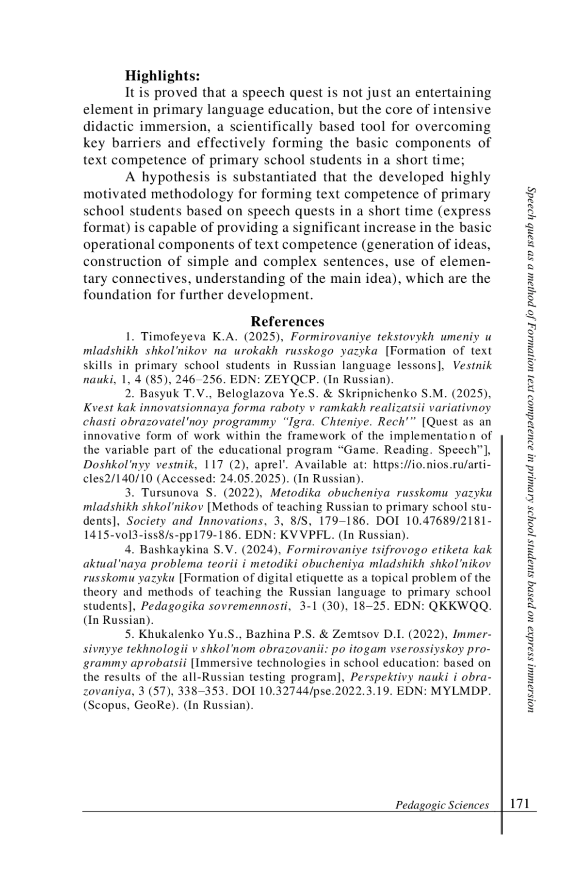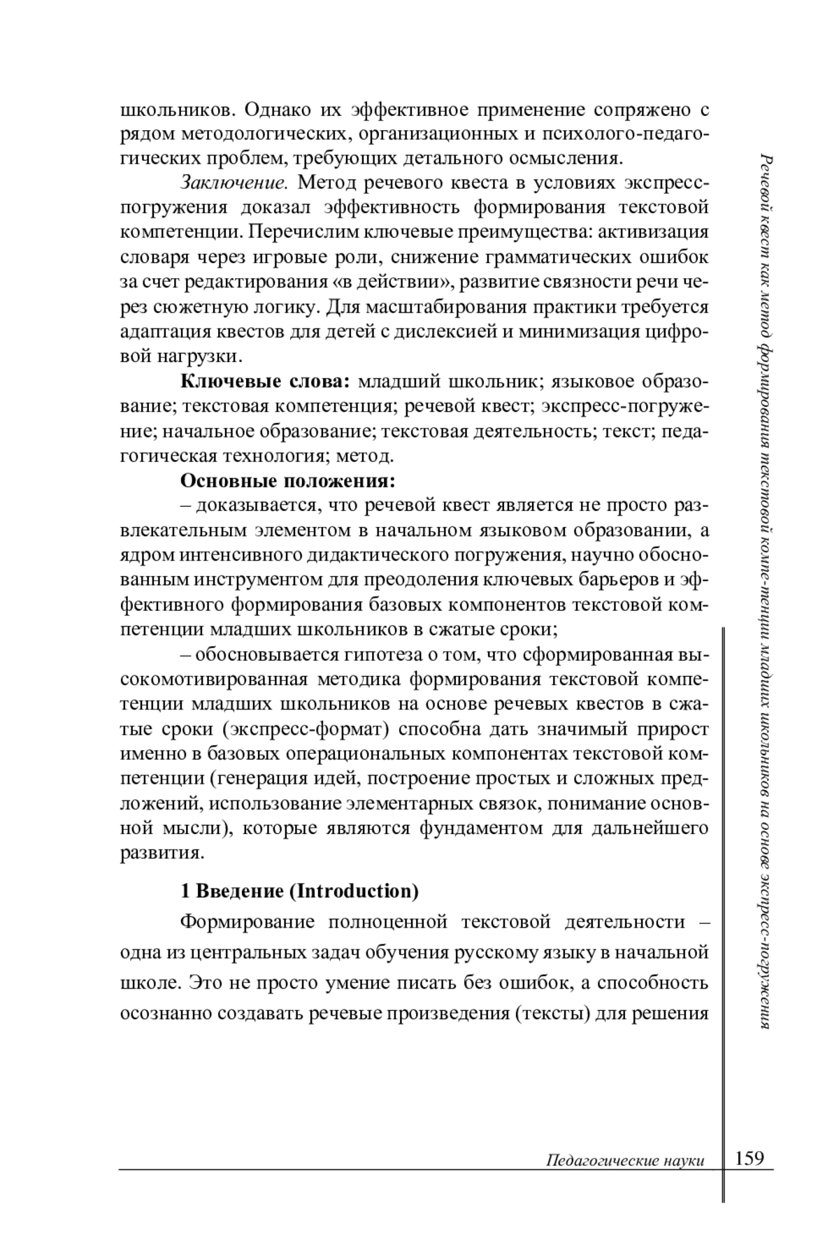 Введение. Статья посвящена актуальной проблеме формирования базовой текстовой компетенции у младших школьников. Предлагается инновационная методика краткосрочного интенсивного «экспресс-погружения», ядром которой выступают речевые квесты. Обосновывается теоретическая база подхода, синтезирующая принципы интенсивного обучения, игровой деятельности (квест-технологии) и компетентностного подхода к развитию речи. Описывается структура погружения, ключевые характеристики речевых квестов как дидактических единиц, направленных на преодоление психологических барьеров (страх «чистого листа», бедность словаря) и формирование операциональных умений (генерация идей, построение предложений, связность, понимание). Приводятся результаты апробации, демонстрирующие положительную динамику в развитии базовых компонентов текстовой компетенции и повышения мотивации обучающихся.