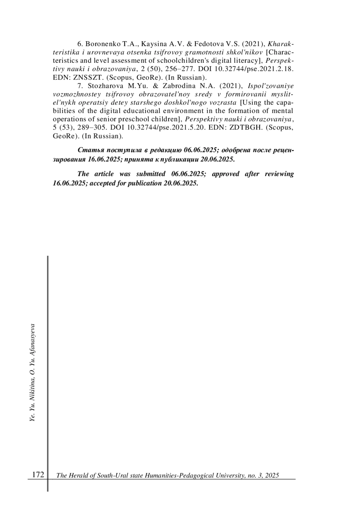 7. Стожарова М. Ю., Забродина Н. А. Использование возможностей цифровой образовательной среды в формировании мыслительных операций детей старшего дошкольного возраста // Перспективы науки и образования. 2021. 5 (53). С. 289-305. 10.32744/pse.2021.5.20. (Scopus, GeoRe). DOI: 10.32744/pse.2021.5.20.Scopus EDN: ZDTBGH