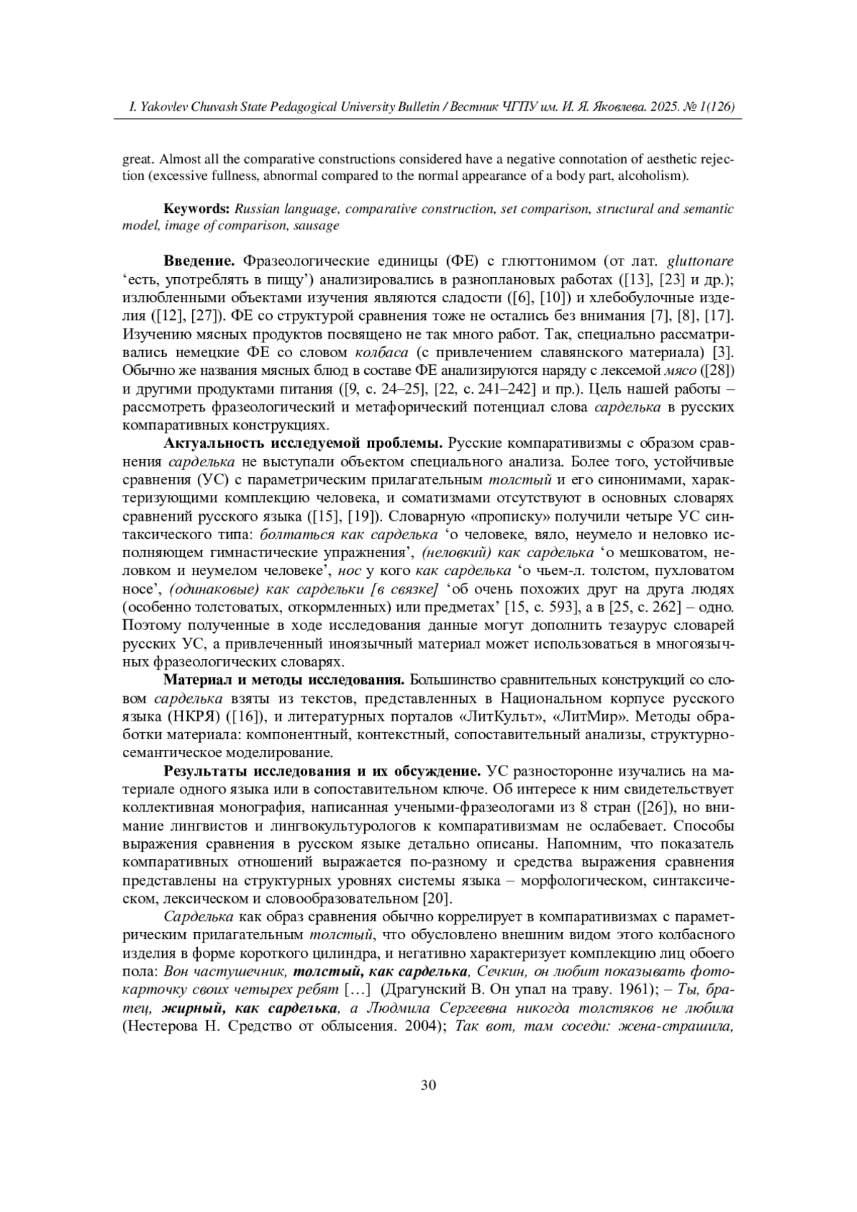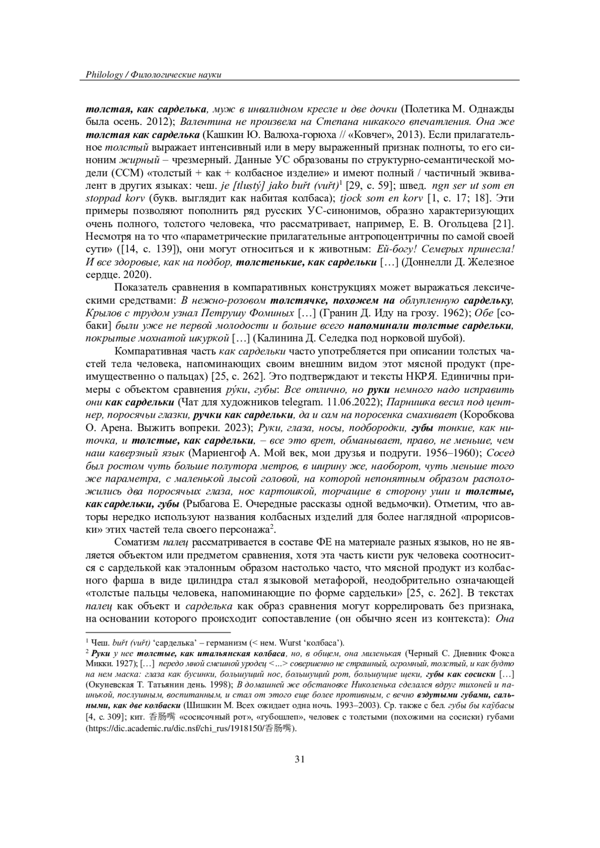 В статье представлены результаты анализа русских компаративных конструкций с глюттонимическим образом сравнения сарделька. Цель работы - рассмотреть фразеологический и метафорический потенциал названия этого колбасного изделия в русских сравнительных конструкциях. Новизна работы заключается в том, что компаративизмы с данным компонентом до сих пор специально не изучались. В процессе описания сравнительных конструкций русского языка используются такие методы обработки материала, как компонентный и контекстный анализы, структурно-семантическое моделирование. Частотность употребления синтаксических образных сравнений с компонентом сарделька в языке и речи позволяет перевести их в разряд устойчивых. Сопоставительный метод (привлечение иноязычного материала) позволил выявить на уровне структурно-семантических моделей, в которых варьируется образ сравнения - мясной продукт цилиндрической формы, полные и частичные эквиваленты в корпусе устойчивых сравнений с параметрическим прилагательным толстый и его синонимами, характеризующими комплекцию человека или какую-л. часть тела (пальцы, губы, руки). Из лексических средств выражения компаративных отношений, как показал проведенный анализ, чаще всего используется слово похожий. В отличие от фразеологического, метафорический потенциал изучаемого мясного продукта невелик. Почти все рассмотренные компаративные конструкции имеют негативную коннотацию эстетического неприятия (чрезмерной полноты, аномального по сравнению с нормальным вида части тела, алкоголизма).