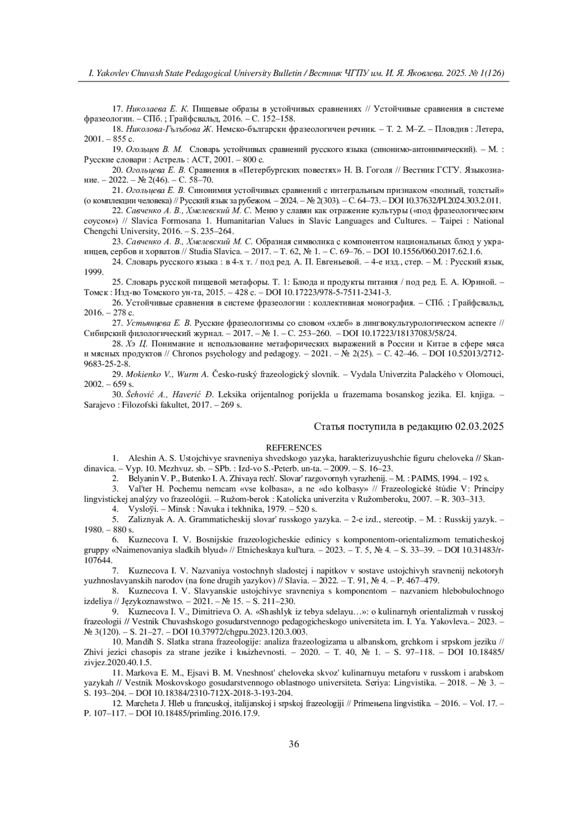 17. Николаева Е. К. Пищевые образы в устойчивых сравнениях // Устойчивые сравнения в системе фразеологии. - СПб.; Грайфсвальд, 2016. - С. 152-158. EDN: YOSZSX
