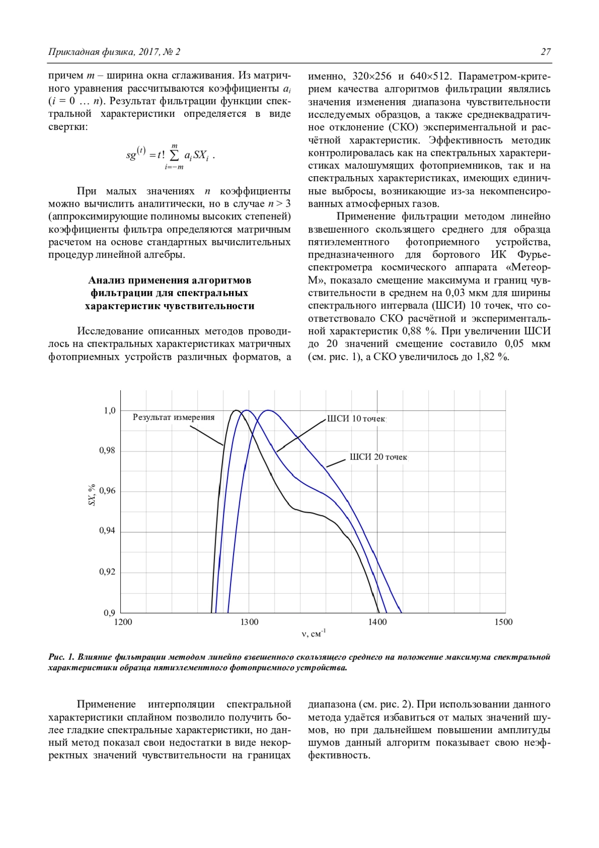Исследованы алгоритмы неразрушающей обработки спектральных характеристик чувствительности линейных и матричных фотоприемных устройств (методы взвешенного и экспоненциального скользящего среднего, интерполяция сплайнами, фильтрация методом СавицкогоГолея). Показаны результаты анализа применения алгоритмов фильтрации для спектральных характеристик чувствительности на примере образцов пятиэлементного фотоприемного устройства, предназначенного для бортового ИК Фурье-спектрометра космического аппарата «Метеор-М», и матричного фотоприемного устройства формата 4576 элементов, имеющего диапазон чувствительности 3,7–4,1 мкм. Анализ результатов показал преимущество фильтрации Савицкого-Голея над стандартными методиками в силу своей вариативности.