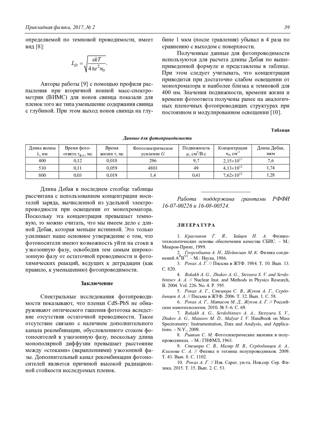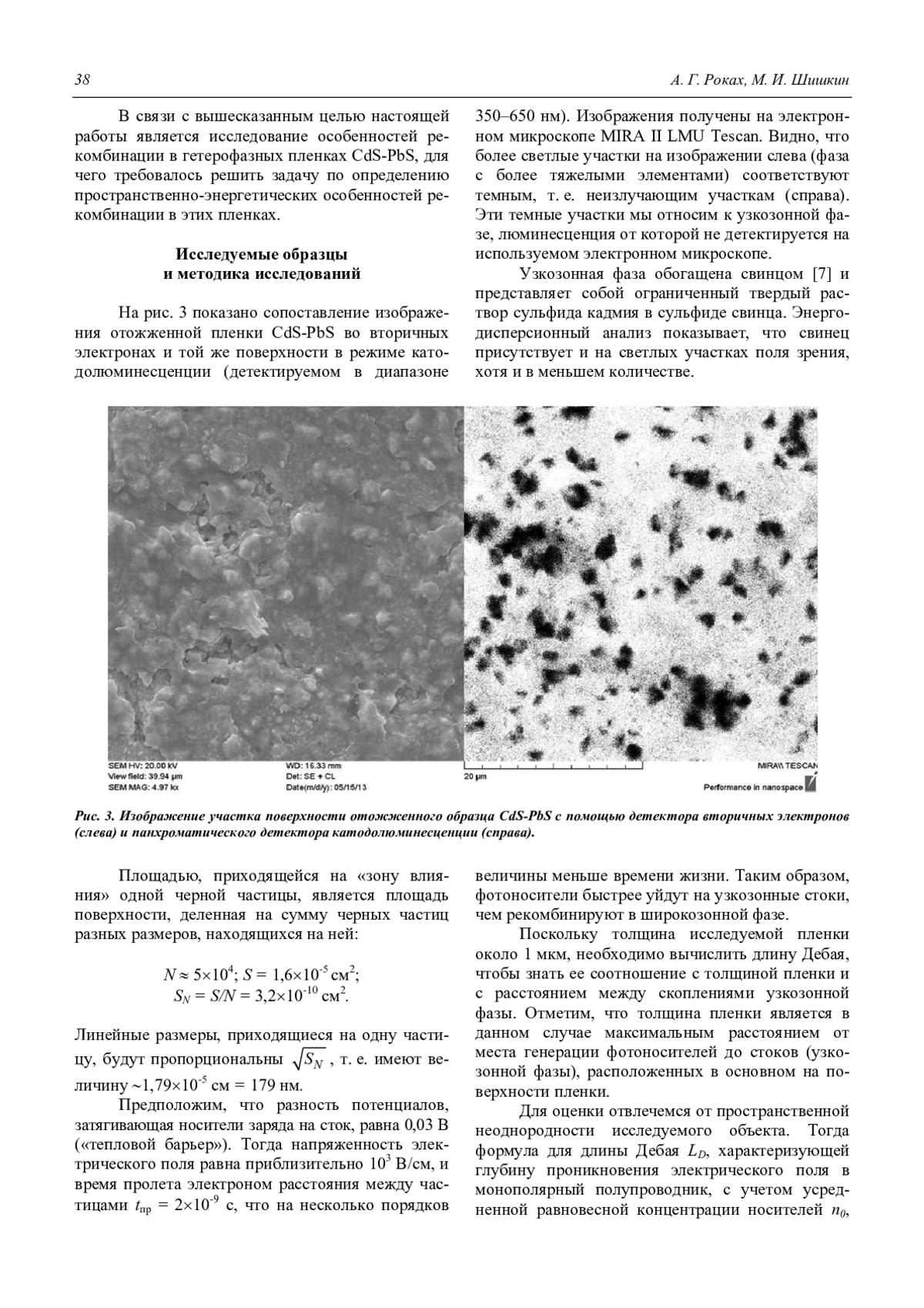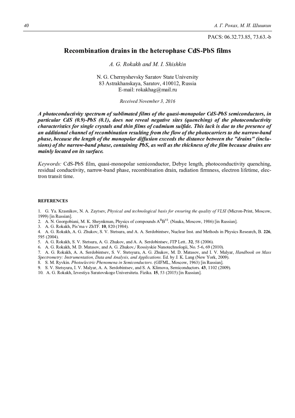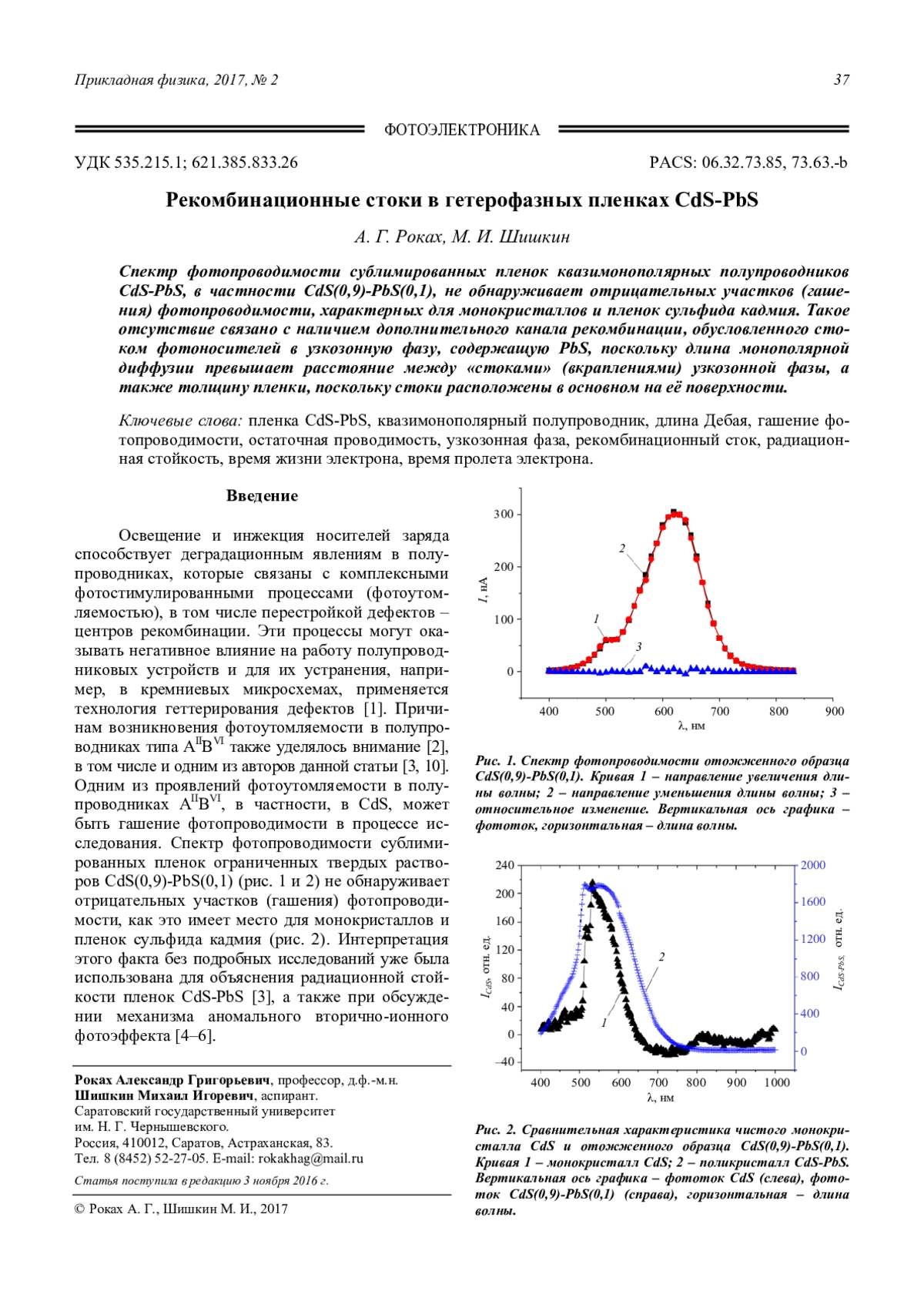 Роках А. Г., Шишкин М. И. Рекомбинационные стоки в гетерофазных пленках CdS-PbS 37