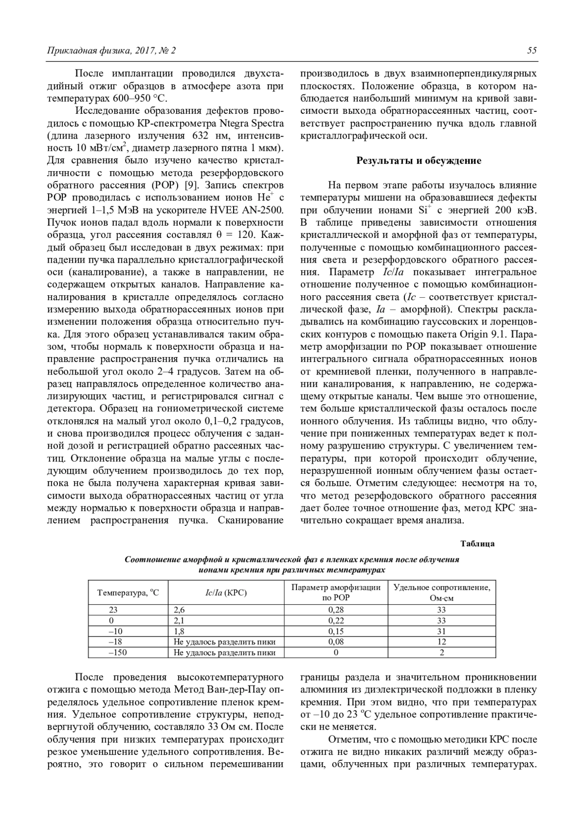 После облучения пленок кремния ионами кремния с энергией 200 кэВ и дозой (флюенсом) 1015 ион/см2 при низких температурах происходит резкое уменьшение удельного сопротивления после проведения последующего высокотемпературного отжига. Это говорит о сильном перемешивании границы раздела и значительном проникновении алюминия из диэлектрической подложки в пленку кремния. При облучении в диапазоне температур от –10 до 23 оС удельное сопротивление после высокотемпературного отжига практически не меняется. При увеличении энергии облучения до 215 кэВ после высокотемпературного отжига наблюдается значительное улучшение качества кристалличности, при этом удельное сопротивление не меняется.